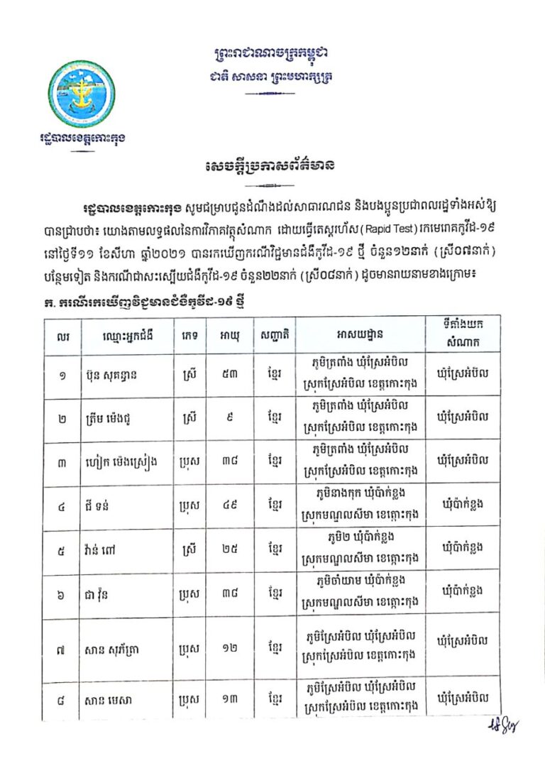 សេចក្តីប្រកាសព័ត៌មាន របស់រដ្ឋបាលខេត្តកោះកុង ស្តីពីការរកឃើញករណីវិជ្ជមានជំងឺកូវីដ-១៩ ចំនួន ១២នាក់ និងករណីជាសះស្បើយជំងឺកូវីដ-១៩ ចំនួន ២២នាក់ នៅថ្ងៃទី១១ ខែសីហា ឆ្នាំ២០២១