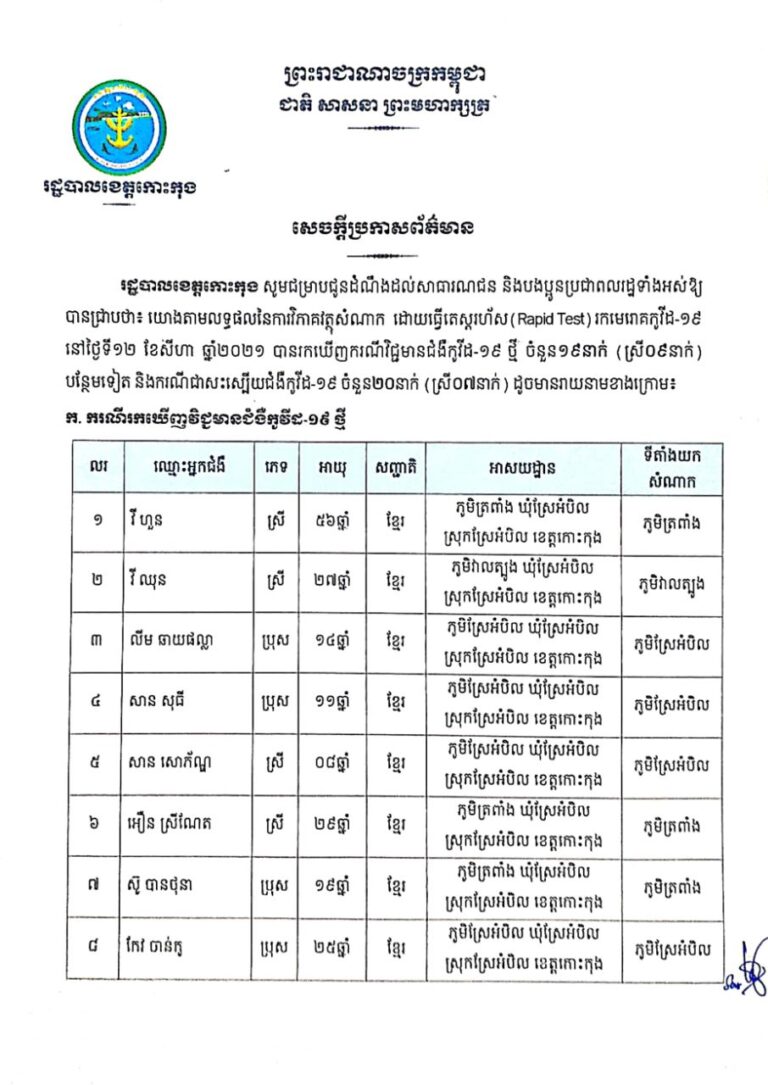 សេចក្តីប្រកាសព័ត៌មាន របស់រដ្ឋបាលខេត្តកោះកុង ស្តីពីការរកឃើញករណីវិជ្ជមានជំងឺកូវីដ-១៩ ចំនួន ១៩នាក់ និងករណីជាសះស្បើយជំងឺកូវីដ-១៩ ចំនួន ២០នាក់ នៅថ្ងៃទី១២ ខែសីហា ឆ្នាំ២០២១