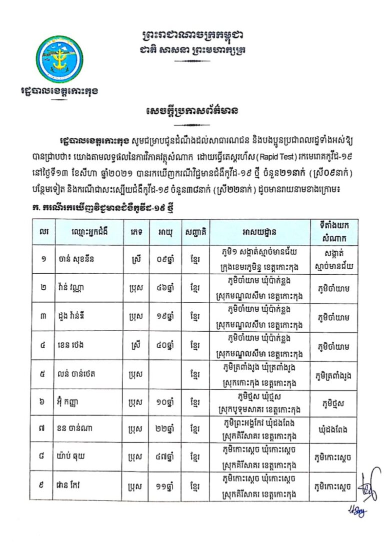 សេចក្តីប្រកាសព័ត៌មាន របស់រដ្ឋបាលខេត្តកោះកុង ស្តីពីការរកឃើញករណីវិជ្ជមានជំងឺកូវីដ-១៩ ចំនួន ២១នាក់ និងករណីជាសះស្បើយជំងឺកូវីដ-១៩ ចំនួន ៣៨នាក់ នៅថ្ងៃទី១៣ ខែសីហា ឆ្នាំ២០២១