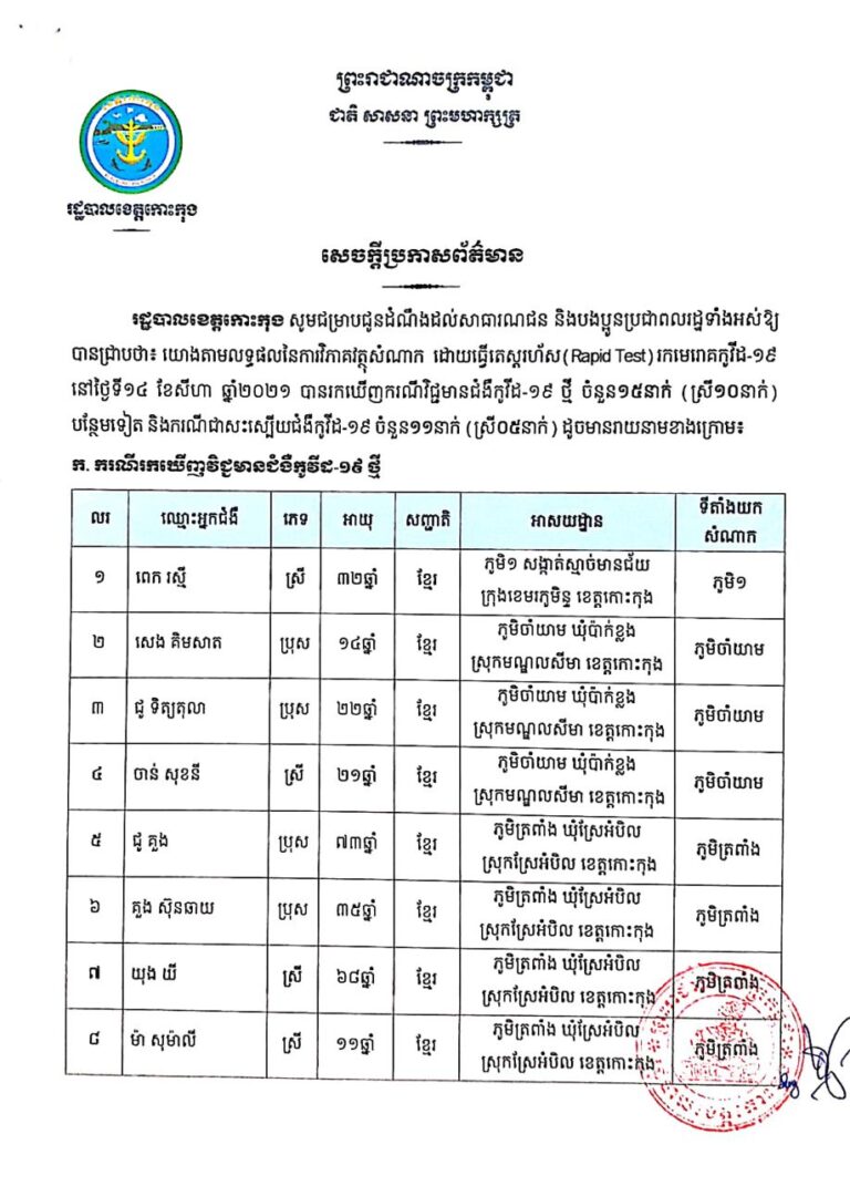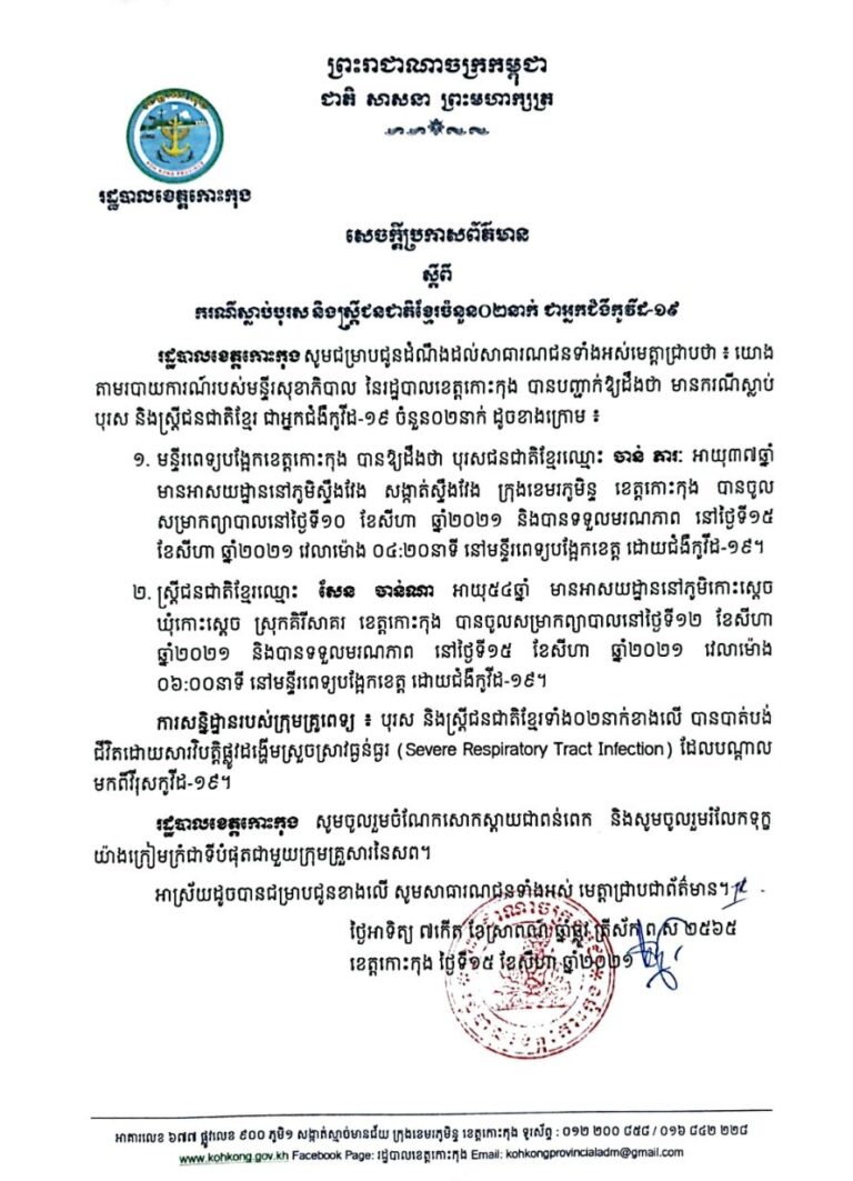 សេចក្តីប្រកាសព័ត៌មាន របស់រដ្ឋបាលខេត្តកោះកុង ស្តីពីករណីបុរស និងស្ត្រី ជនជាតិខ្មែរ ចំនួន ០២នាក់ ជាអ្នកជំងឺកូវីដ-១៩ នៅថ្ងៃទី១៥ ខែសីហា ឆ្នាំ២០២១