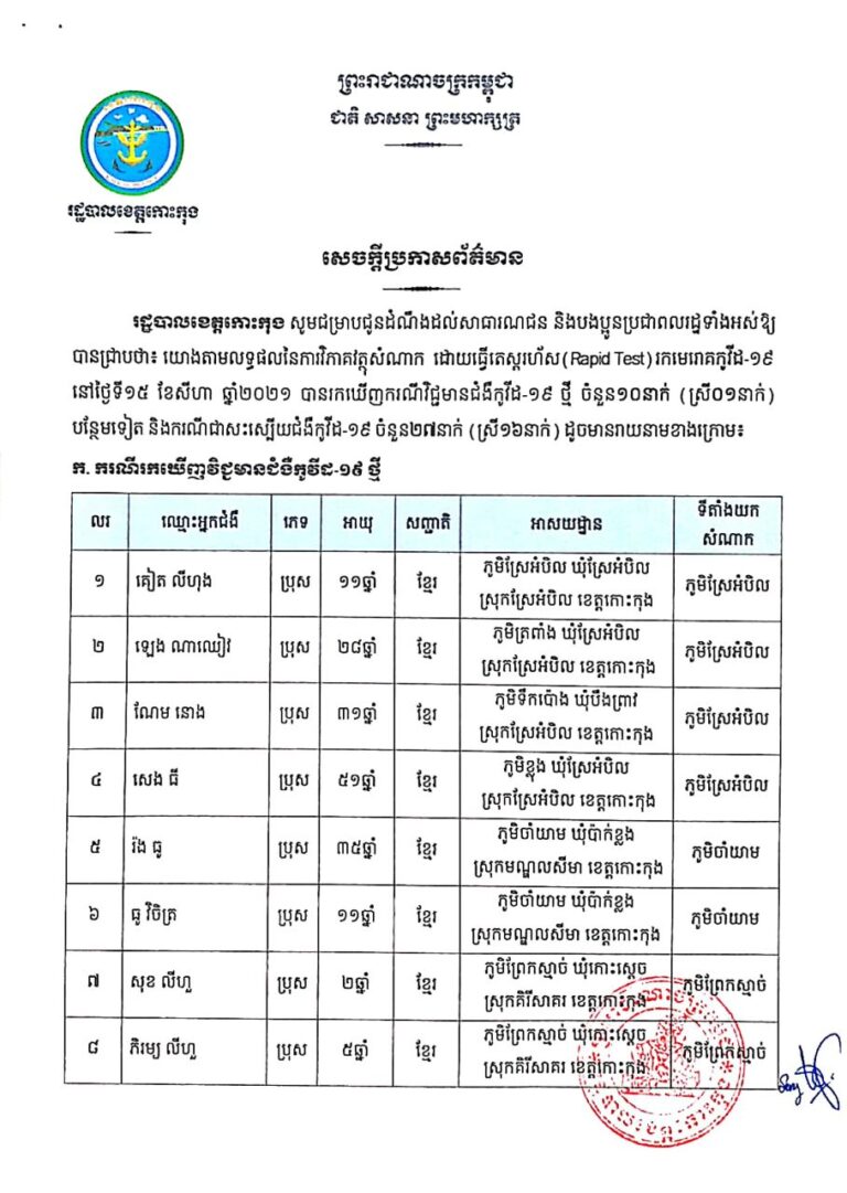 សេចក្តីប្រកាសព័ត៌មាន របស់រដ្ឋបាលខេត្តកោះកុង ស្តីពីការរកឃើញករណីវិជ្ជមានជំងឺកូវីដ-១៩ ចំនួន ១០នាក់ និងករណីជាសះស្បើយជំងឺកូវីដ-១៩ ចំនួន ២៧នាក់ នៅថ្ងៃទី១៥ ខែសីហា ឆ្នាំ២០២១