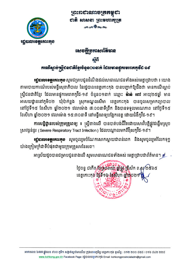 សេចក្តីប្រកាសព័ត៌មាន ស្តីពីករណីស្លាប់ស្ត្រីជនជាតិខ្មែរចំនួន០១នាក់ ដែលមានផ្ទុកមេរោគកូវីដ-១៩ នៅថ្ងៃទី១៥ ខែសីហា ឆ្នាំ២០២១