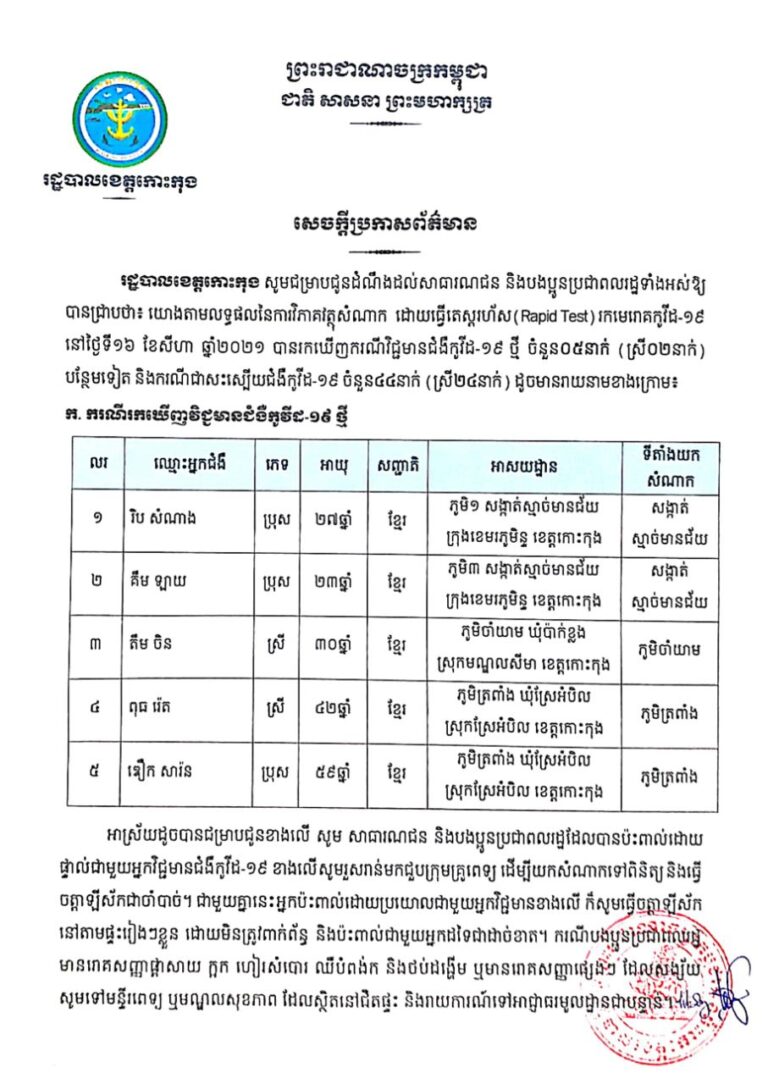 សេចក្តីប្រកាសព័ត៌មាន របស់រដ្ឋបាលខេត្តកោះកុង ស្តីពីការរកឃើញករណីវិជ្ជមានជំងឺកូវីដ-១៩ ចំនួន ០៥នាក់ និងករណីជាសះស្បើយជំងឺកូវីដ-១៩ ចំនួន ៤៤នាក់ នៅថ្ងៃទី១៦ ខែសីហា ឆ្នាំ២០២១