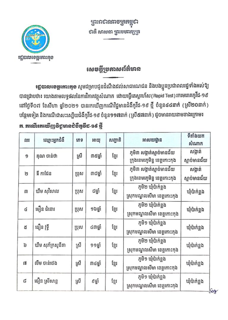 សេចក្តីប្រកាសព័ត៌មាន របស់រដ្ឋបាលខេត្តកោះកុង ស្តីពីការរកឃើញករណីវិជ្ជមានជំងឺកូវីដ-១៩ ចំនួន ៤៤នាក់ និងករណីជាសះស្បើយជំងឺកូវីដ-១៩ ចំនួន ១១៧នាក់ នៅថ្ងៃទី០៧ ខែសីហា ឆ្នាំ២០២១