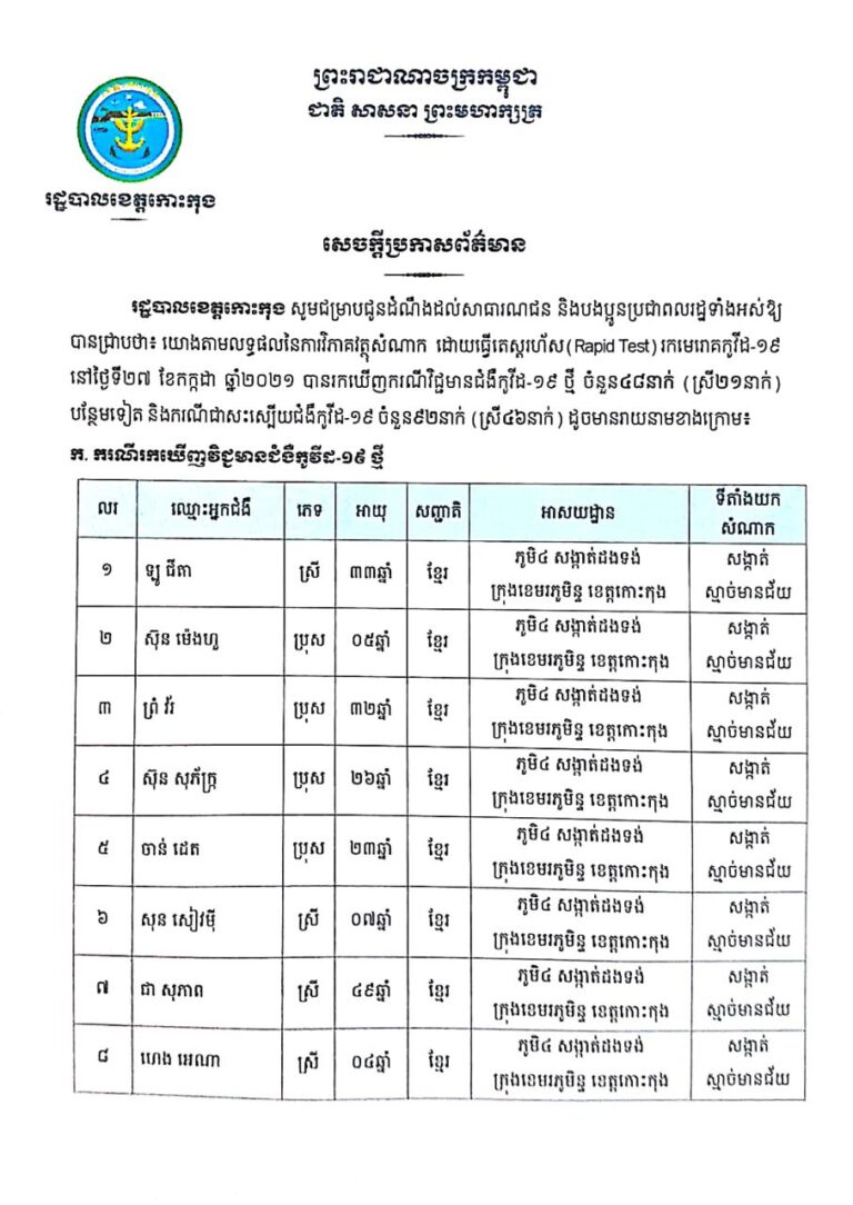 សេចក្តីប្រកាសព័ត៌មាន របស់រដ្ឋបាលខេត្តកោះកុង ស្តីពីការរកឃើញករណីវិជ្ជមានជំងឺកូវីដ-១៩ ចំនួន ៤៨នាក់ និងករណីជាសះស្បើយជំងឺកូវីដ-១៩ ចំនួន ៩២នាក់ នៅថ្ងៃទី២៧ ខែកក្កដា ឆ្នាំ២០២១