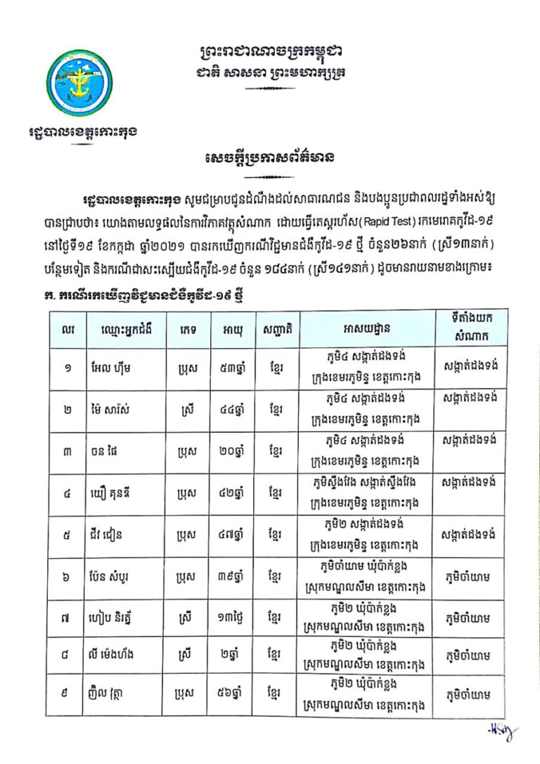 សេចក្តីប្រកាសព័ត៌មាន របស់រដ្ឋបាលខេត្តកោះកុង ស្តីពីករណីរកឃើញវិជ្ជមានជំងឺកូវីដ-១៩ ចំនួន ២៦ នាក់ និងករណីជាសះស្បើយជំងឺកូវីដ-១៩ ចំនួន ១៨៤ នាក់ នៅថ្ងៃទី១៩ ខែកក្កដា ឆ្នាំ២០២១