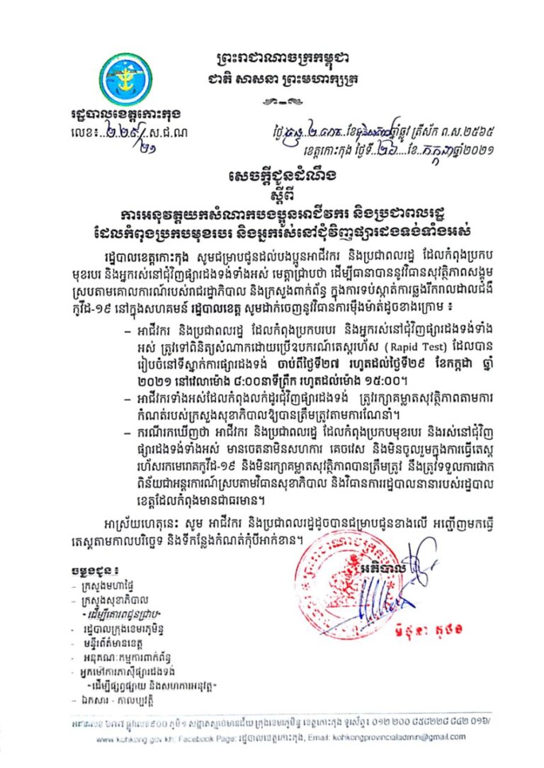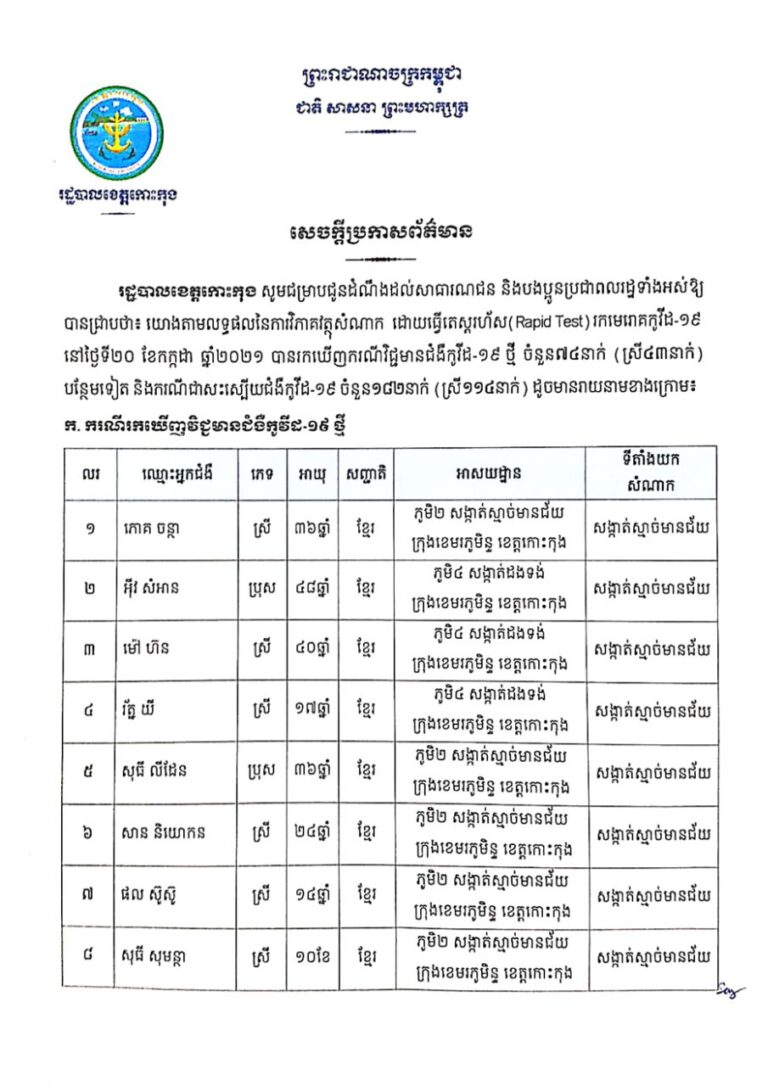 សេចក្តីប្រកាសព័ត៌មាន របស់រដ្ឋបាលខេត្តកោះកុង ស្តីពីការរកឃើញករណីវិជ្ជមានជំងឺកូវីដ-១៩ ចំនួន ៧៤ នាក់ និងករណីជាសះស្បើយជំងឺកូវីដ-១៩ ចំនួន ១៨២ នាក់ នៅថ្ងៃទី២០ ខែកក្កដា ឆ្នាំ២០២១