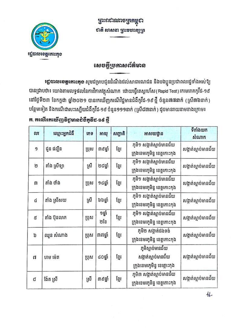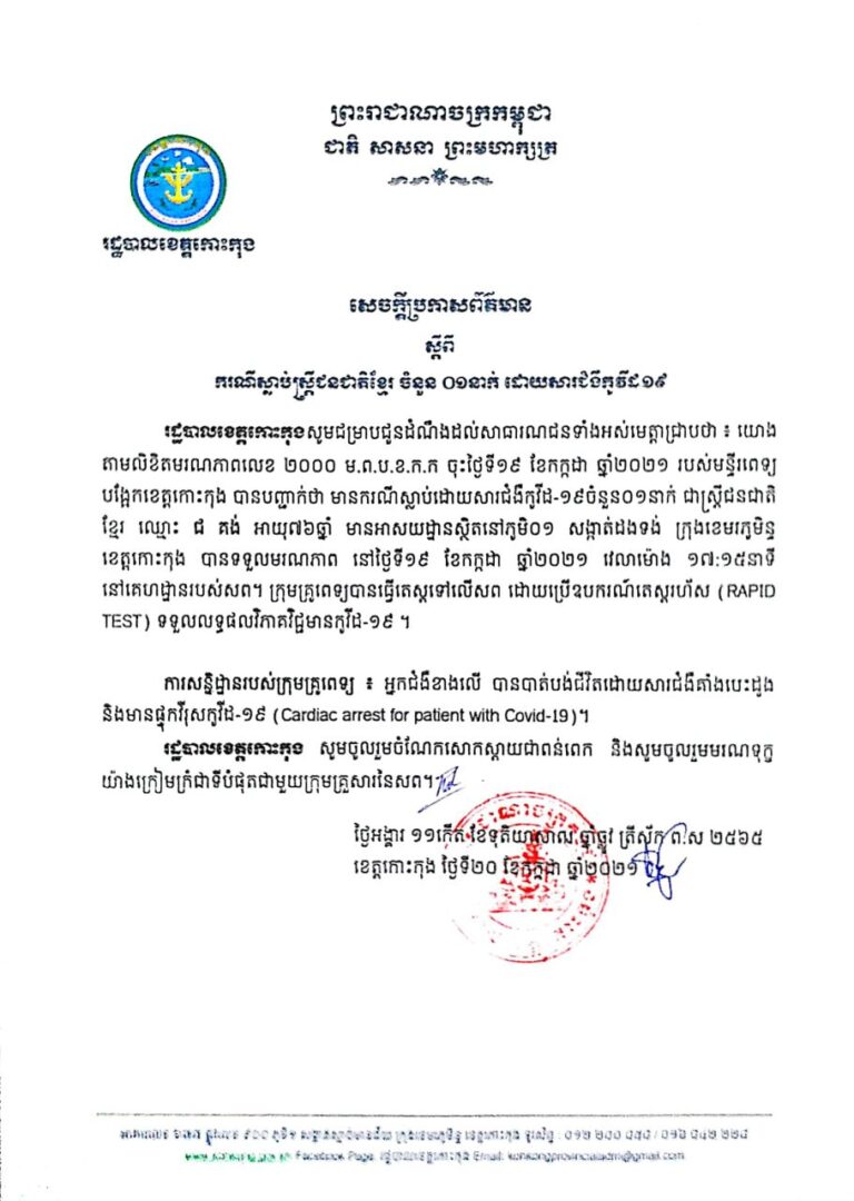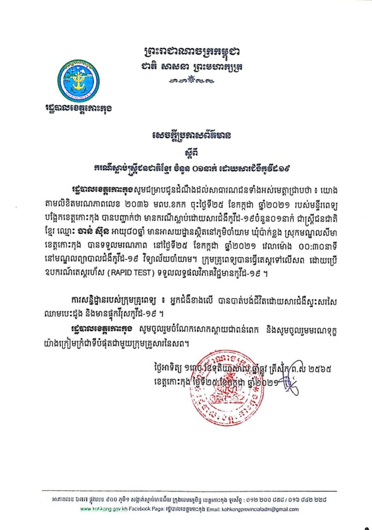 សេចក្តីប្រកាសព័ត៌មាន របស់រដ្ឋបាលខេត្តកោះកុង ស្តីពីករណីស្លាប់ស្ត្រីជនជាតិខ្មែរ ចំនួន ០១នាក់ ដោយសារជំងឺកូវីដ-១៩ នៅថ្ងៃទី២៥ ខែកក្កដា ឆ្នាំ២០២១