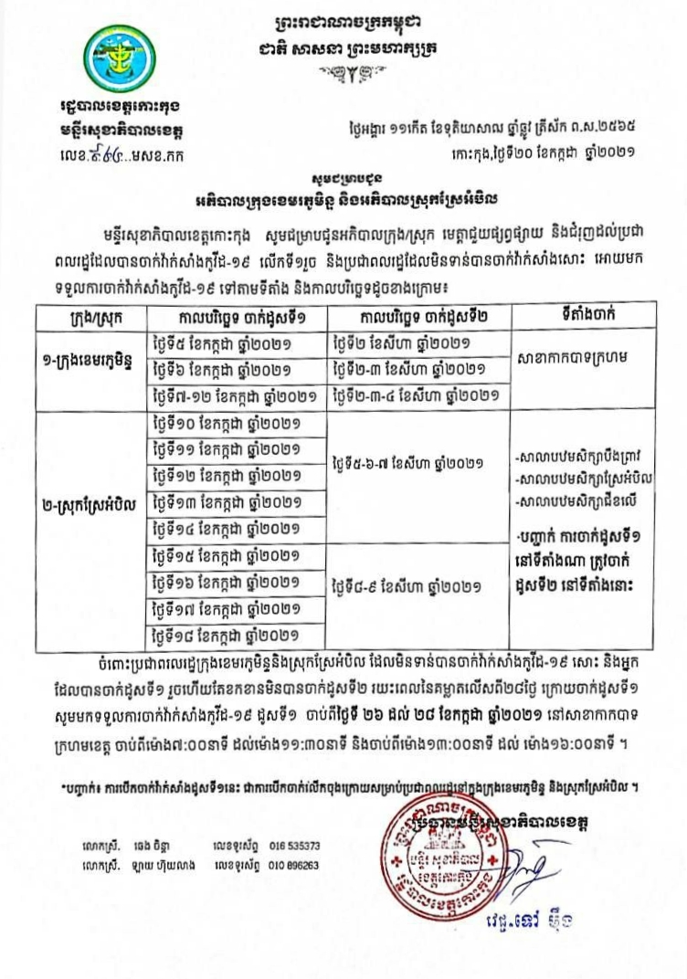 សេចក្តីជូនដំណឹង ស្តីពីការជម្រុញដល់ប្រជាពលរដ្ឋ ដែលបានចាក់វ៉ាក់សាំងបង្ការជំងឺកូវីដ-១៩ លើកទី១រួច និងប្រជាពលរដ្ឋមិនទាន់ចាក់វ៉ាក់សាំង ឱ្យមកទទួលការចាក់វ៉ាក់សាំងបង្ការជំងឺកូវីដ-១៩ តាមទីតាំង និងកាលបរិច្ឆេទ ដូចខាងក្រោម :