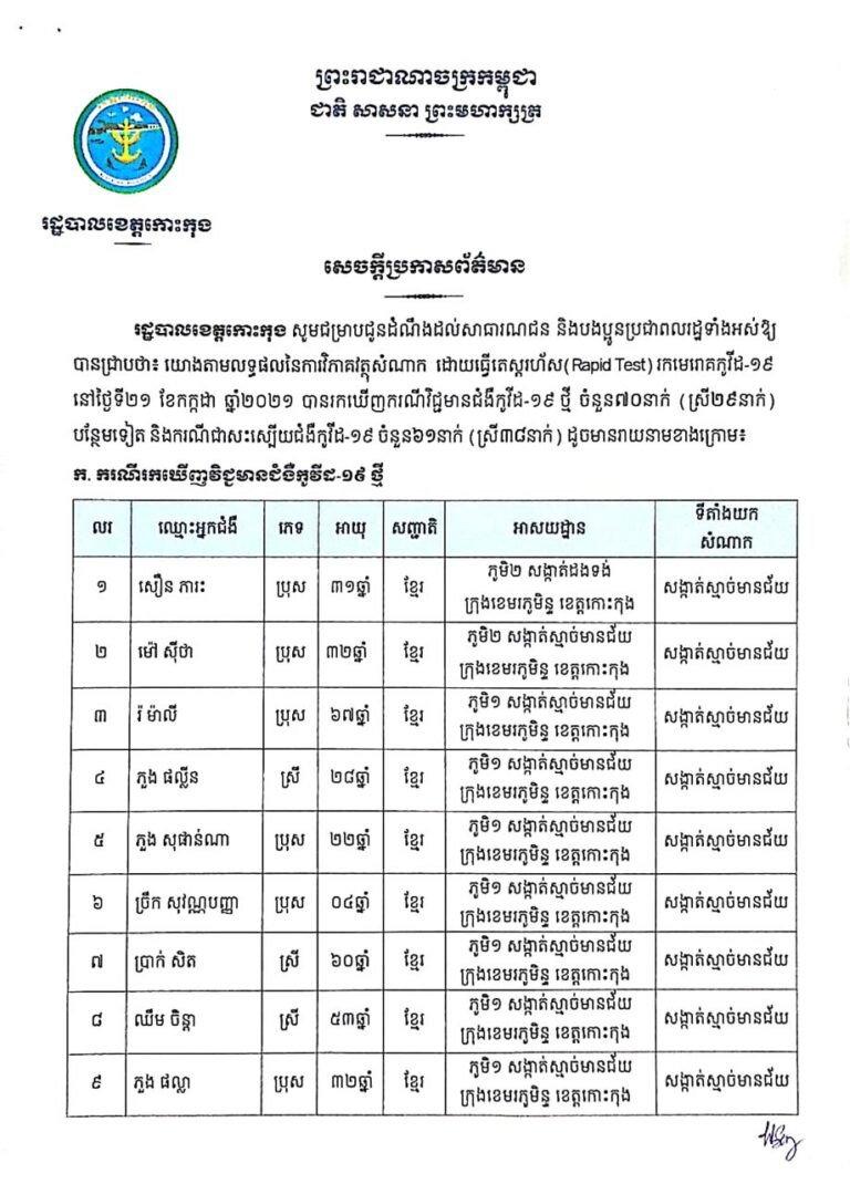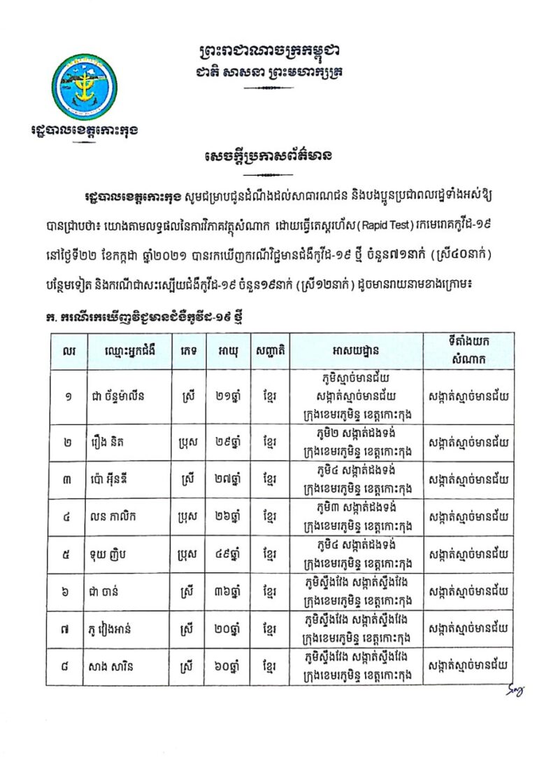 សេចក្តីប្រកាសព័ត៌មាន របស់រដ្ឋបាលខេត្តកោះកុង ស្តីពីការឃើញករណីវិជ្ជមានជំងឺកូវីដ-១៩ ចំនួន ៧០នាក់ និងករណីជាសះស្បើយជំងឺកូវីដ-១៩ ចំនួន ៦១នាក់ នៅថ្ងៃទី២១ ខែកក្កដា ឆ្នាំ២០២១