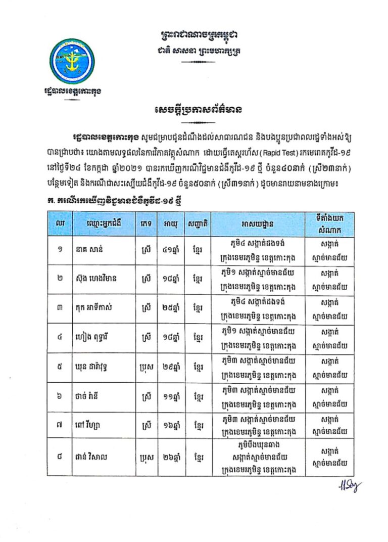 សេចក្តីប្រកាសព័ត៌មាន របស់រដ្ឋបាលខេត្តកោះកុង ស្តីពីការរកឃើញករណីវិជ្ជមានជំងឺកូវីដ-១៩ ចំនួន ៤០នាក់ និងករណីជាសះស្បើយជំងឺកូវីដ-១៩ ចំនួន ៥០នាក់ នៅថ្ងៃទី២៤ ខែកក្កដា ឆ្នាំ២០២១