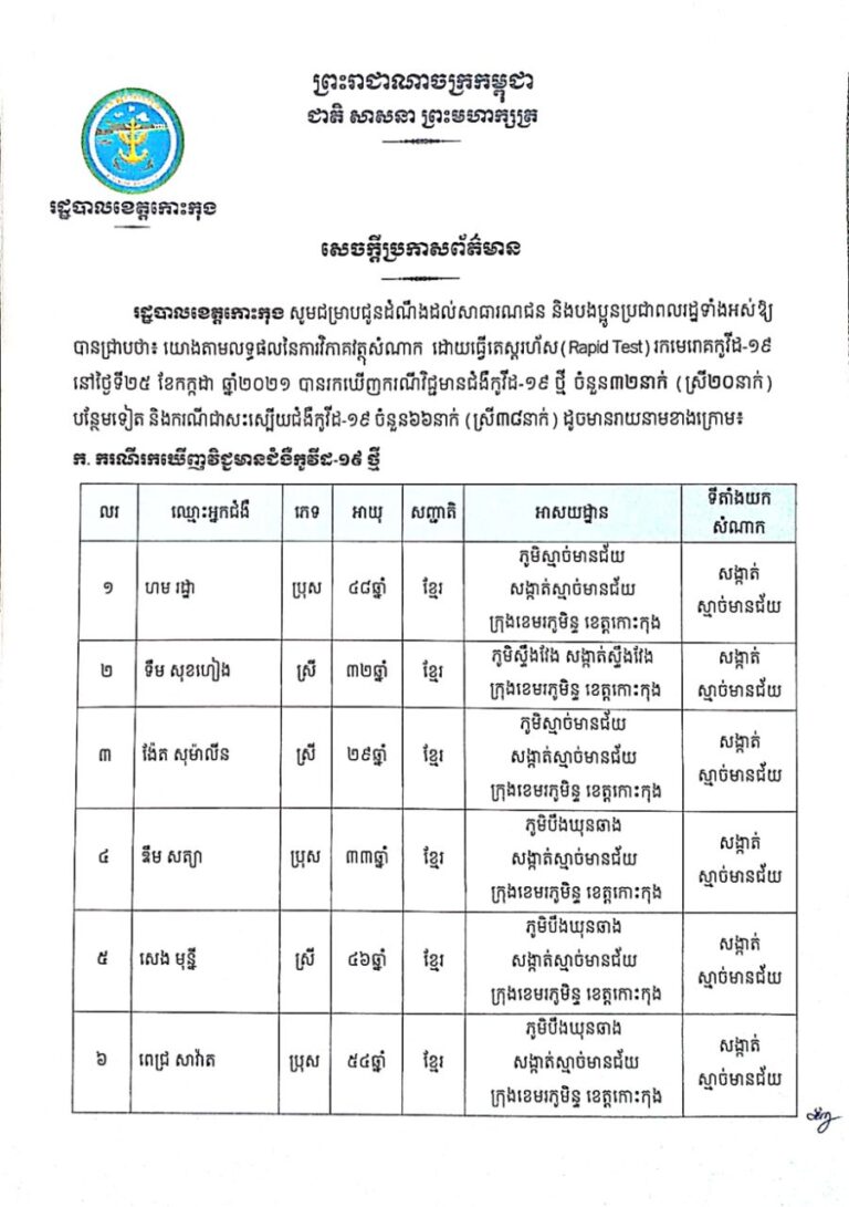 សេចក្តីប្រកាសព័ត៌មាន របស់រដ្ឋបាលខេត្តកោះកុង ស្តីពីការរកឃើញករណីវិជ្ជមានជំងឺកូវីដ-១៩ ចំនួន ៣២នាក់ និងករណីជាសះស្បើយជំងឺកូវីដ-១៩ ចំនួន ៦៦នាក់ នៅថ្ងៃទី២៥ ខែកក្កដា ឆ្នាំ២០២១