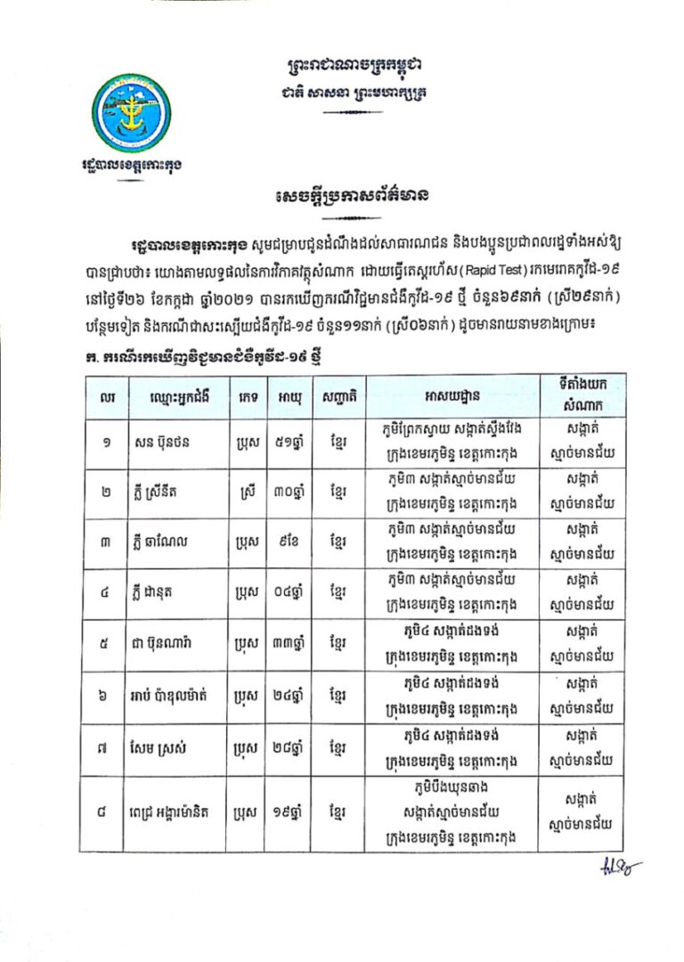 សេចក្តីប្រកាសព័ត៌មាន របស់រដ្ឋបាលខេត្តកោះកុង ស្តីពីការរកឃើញករណីវិជ្ជមានជំងឺកូវីដ-១៩ ចំនួន ៦៩នាក់ និងករណីជាសះស្បើយជំងឺកូវីដ-១៩ ចំនួន ១១នាក់ នៅថ្ងៃទី២៦ ខែកក្កដា ឆ្នាំ២០២១