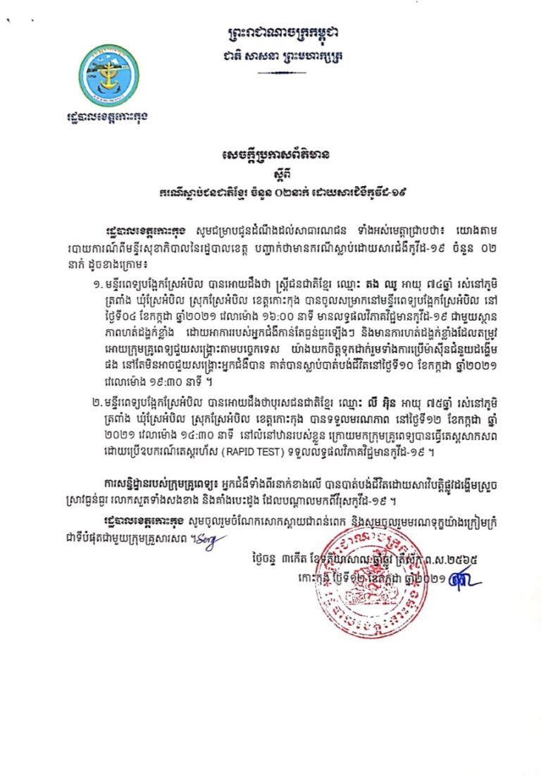 សេចក្ដីប្រកាសព័ត៌មាន របស់រដ្ឋបាលខេត្តកោះកុង ស្តីពីករណីស្លាប់ជនជាតិខ្មែរ ចំនួន ០២នាក់ ដោយសារជំងឺកូវីដ-១៩ នាថ្ងៃទី១២ ខែកក្កដា ឆ្នាំ២០២១