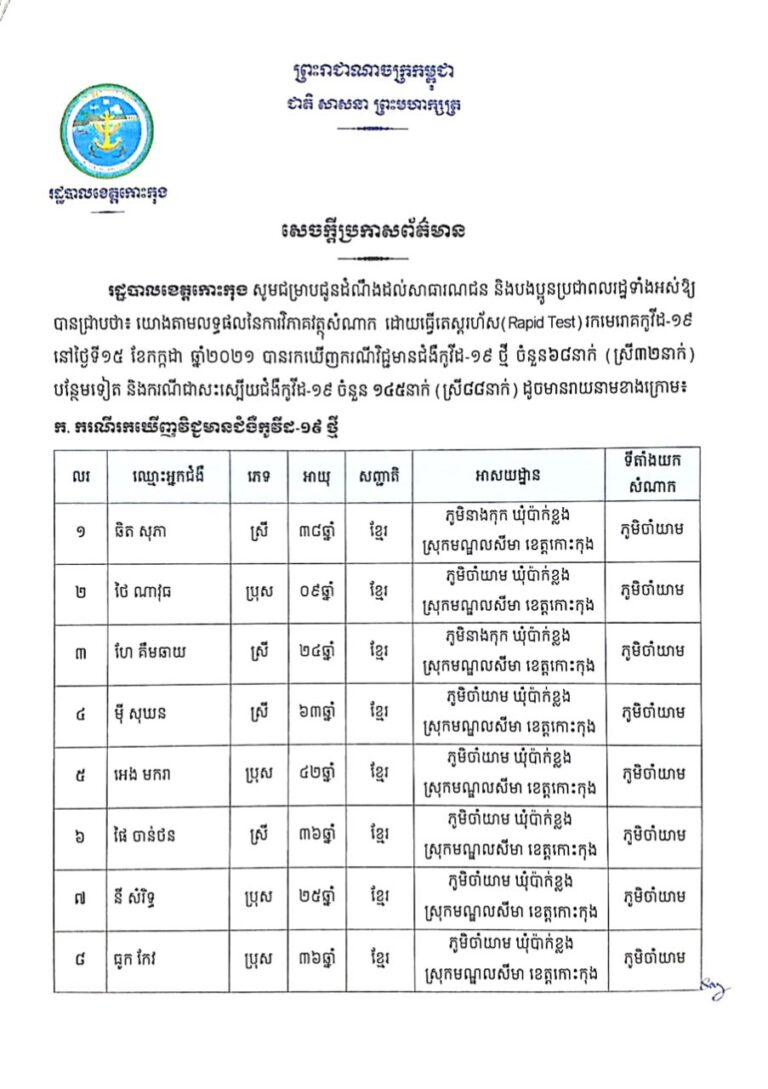 សេចក្តីប្រកាសព័ត៌មាន របស់រដ្ឋបាលខេត្តកោះកុង ស្ដីពីការរកឃេីញករណីអ្នកជំងឺកូវីដ-១៩ ចំនួន ៦៨ នាក់ និងករណីជាសះស្បើយជំងឺកូវីដ-១៩ ចំនួន ១៤៥ នាក់ នាថ្ងៃទី១៥ ខែកក្កដា ឆ្នាំ២០២១