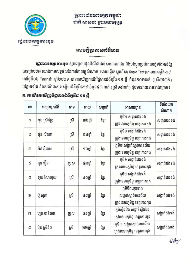 សេចក្តីប្រកាសព័ត៌មាន របស់រដ្ឋបាលខេត្តកោះកុង ស្តីពីការរកឃើញករណីវិជ្ជមានជំងឺកូវីដ-១៩ ចំនួន ១០២ នាក់ និងករណីជាសះស្បើយជំងឺកូវីដ-១៩ ចំនួន ៤៣ នាក់ នាថ្ងៃទី០៦ ខែកក្កដា ឆ្នាំ២០២១