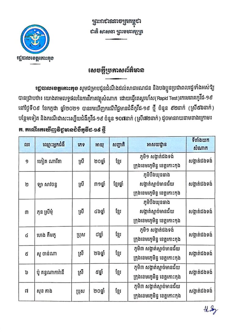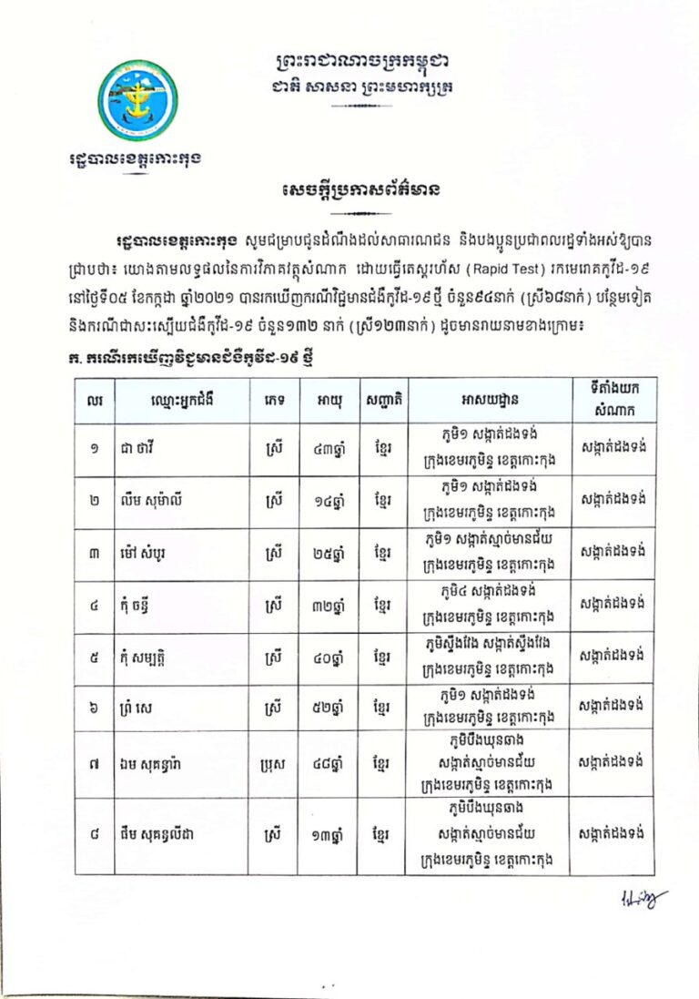 សេចក្តីប្រកាសព័ត៌មាន របស់រដ្ឋបាលខេត្តកោះកុង ស្តីពីការរកឃើញករណីវិជ្ជមានជំងឺកូវីដ-១៩ ចំនួន ៩៤ នាក់ និងករណីជាសះស្បើយជំងឺកូវីដ-១៩ ចំនួន ១៣២ នាក់ នាថ្ងៃទី០៥ ខែកក្កដា ឆ្នាំ២០២១