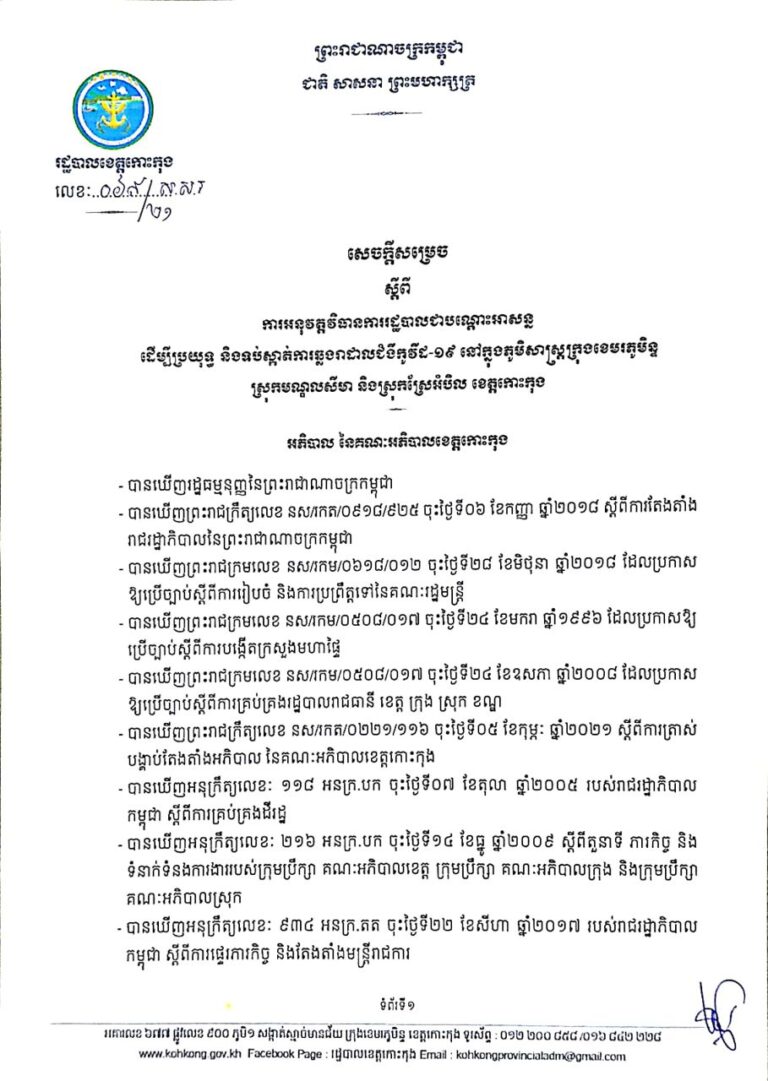 សេចក្តីសម្រេច របស់រដ្ឋបាលខេត្តកោះកុង ស្តីពីការអនុវត្តវិធានការរដ្ឋបាលជាបណ្តោះអាសន្ន ដើម្បីប្រយុទ្ធ និងទប់ស្កាត់ការឆ្លងរាលដាលជំងឺកូវីដ-១៩ នៅក្នុងភូមិសាស្ត្រក្នុងក្រុងខេមរភូមិន្ទ ស្រុកមណ្ឌលសីមា និងស្រុកស្រែអំបិល ខេត្តកោះកុង