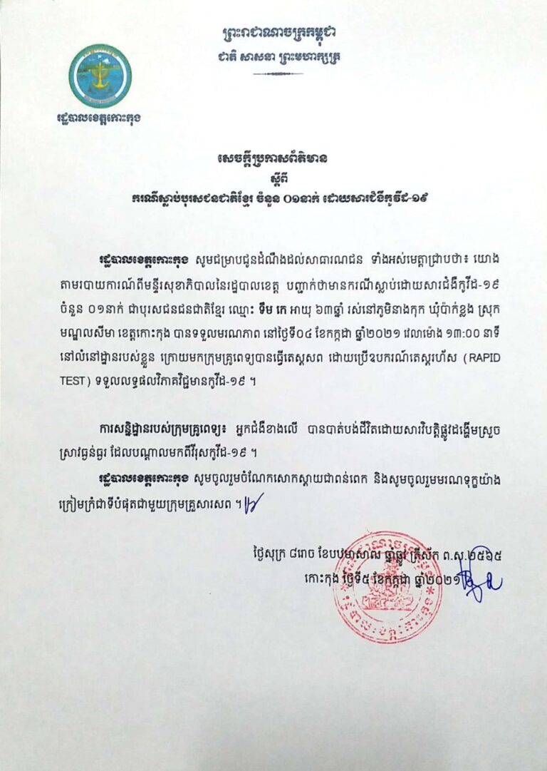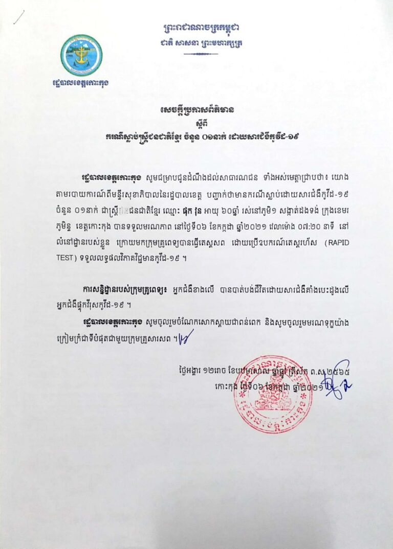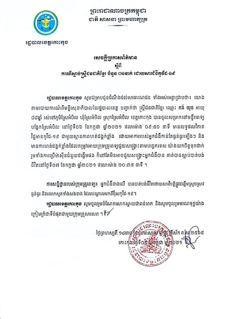 សេចក្ដីប្រកាសព័ត៌មាន របស់រដ្ឋបាលខេត្តកោះកុង ស្តីពីករណីស្លាប់ស្ត្រីជនជាតិខ្មែរ ចំនួន ០១នាក់ ដោយសារជំងឺកូវីដ-១៩ នាថ្ងៃទី៦ ខែកក្កដា ឆ្នាំ២០២១