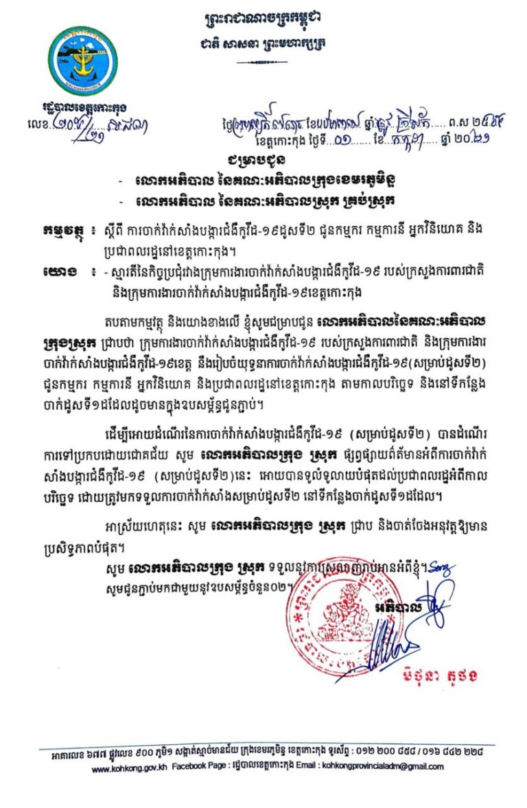 សេចក្តីជូនដំណឹង ស្តីពីការចាក់វ៉ាក់សាំងបង្ការជំងឺកូវីដ-១៩ ដូសទី២ ជូនកម្មករ កម្មការនី អ្នកវិនិយោគ និងប្រជាពលរដ្ឋ នៅខេត្តកោះកុង