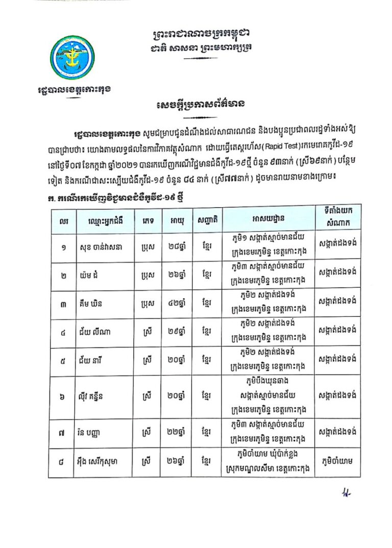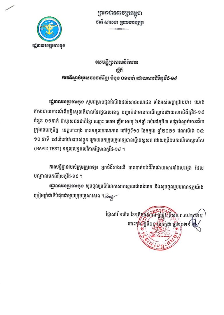 សេចក្ដីប្រកាសព័ត៌មាន របស់រដ្ឋបាលខេត្តកោះកុង ស្តីពីករណីស្លាប់ស្ត្រីជនជាតិខ្មែរ ចំនួន ០១នាក់ ដោយសារជំងឺកូវីដ-១៩ នាថ្ងៃទី០៧ ខែកក្កដា ឆ្នាំ២០២១