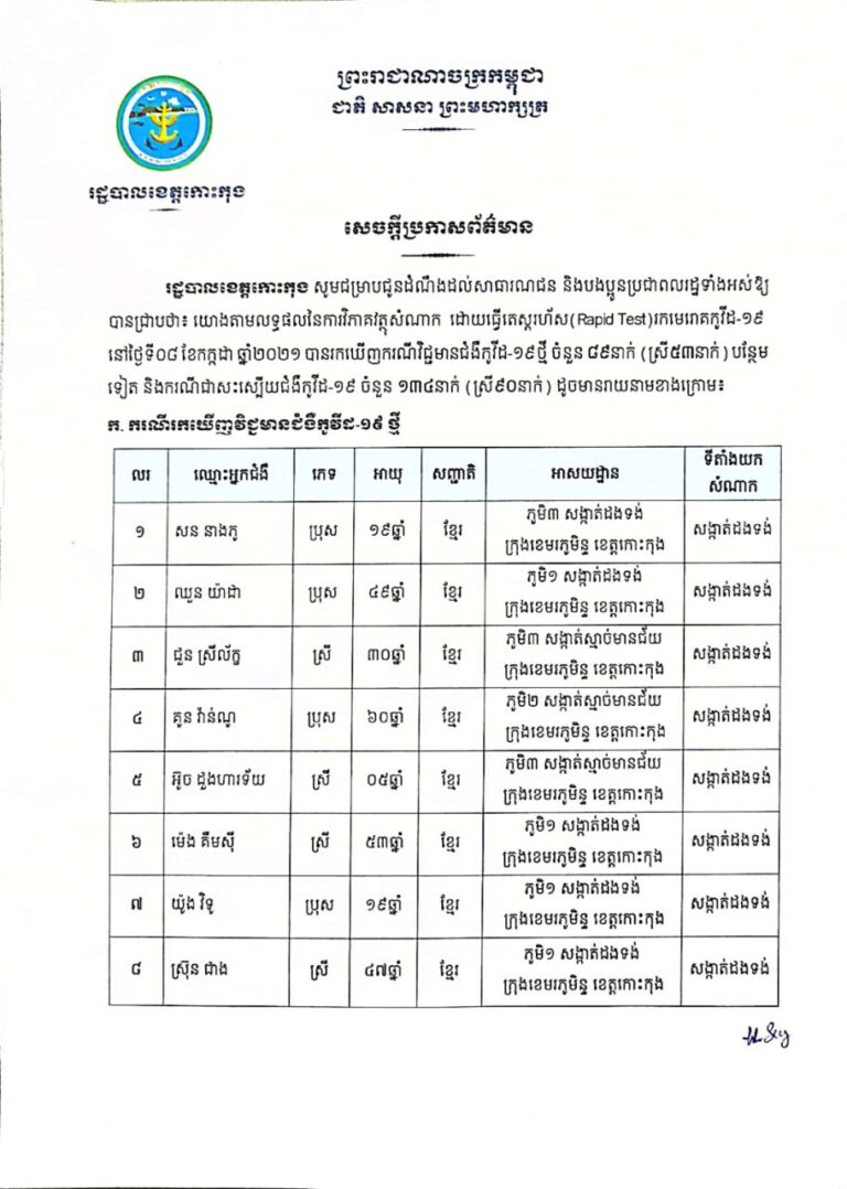 សេចក្តីប្រកាសព័ត៌មាន របស់រដ្ឋបាលខេត្តកោះកុង ស្តីពីការរកឃើញករណីវិជ្ជមានជំងឺកូវីដ-១៩ ចំនួន ៨៩ នាក់ និងករណីជាសះស្បើយជំងឺកូវីដ-១៩ ចំនួន ១៣៤ នាក់ នាថ្ងៃទី០៨ ខែកក្កដា ឆ្នាំ២០២១