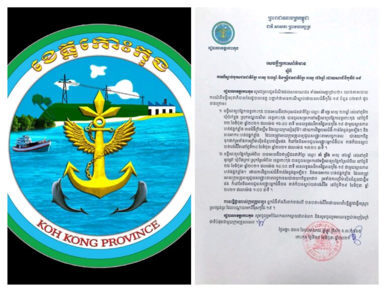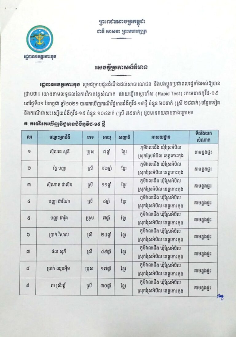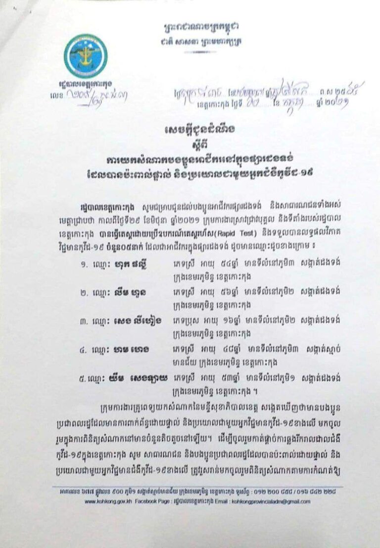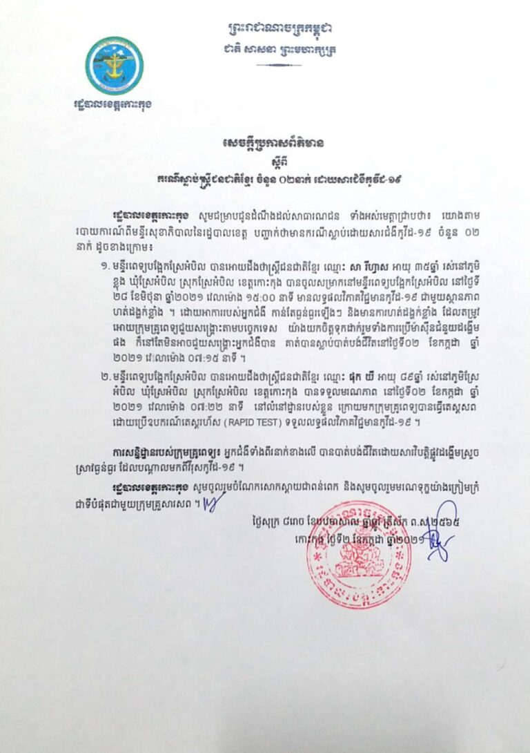 សេចក្ដីប្រកាសព័ត៌មាន របស់រដ្ឋបាលខេត្តកោះកុង ស្តីពីករណីស្លាប់ជនជាតិខ្មែរ ចំនួន ០២នាក់ ដោយសារជំងឺកូវីដ-១៩