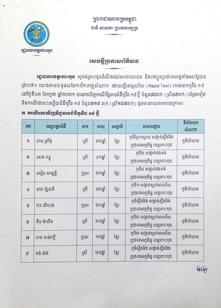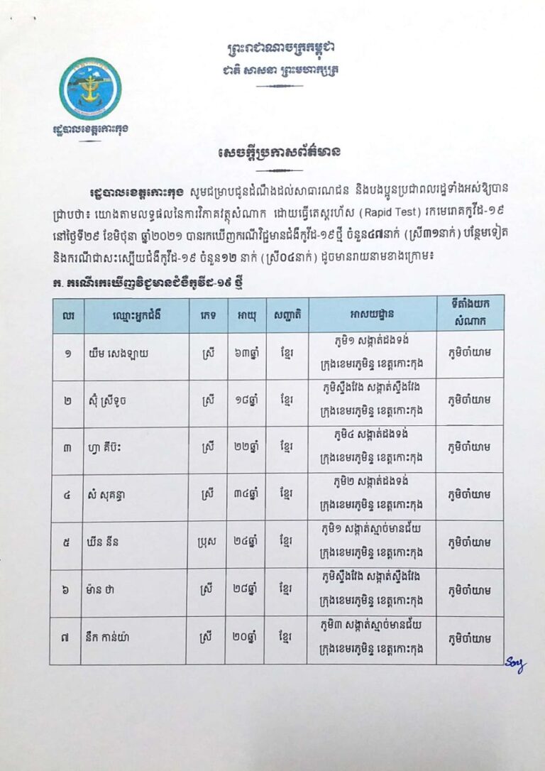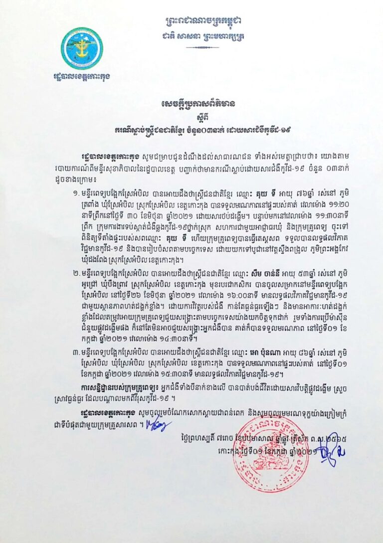 សេចក្តីប្រកាសព័ត៌មាន របស់រដ្ឋបាលខេត្តកោះកុង ស្តីពីករណីស្លាប់ជនជាតិខ្មែរ ចំនួន ០៣ នាក់ ដោយសារជំងឺកូវីដ-១៩