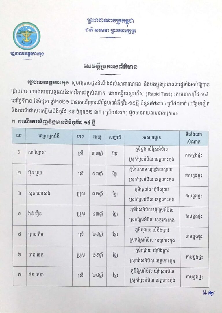 សេចក្តីប្រកាសព័ត៌មាន របស់រដ្ឋបាលខេត្តកោះកុង ស្តីពីការរកឃើញករណីវិជ្ជមានជំងឺកូវីដ-១៩ ចំនួន ៥៥ នាក់ និងករណីជាសះស្បើយជំងឺកូវីដ-១៩ ចំនួន ១២ នាក់