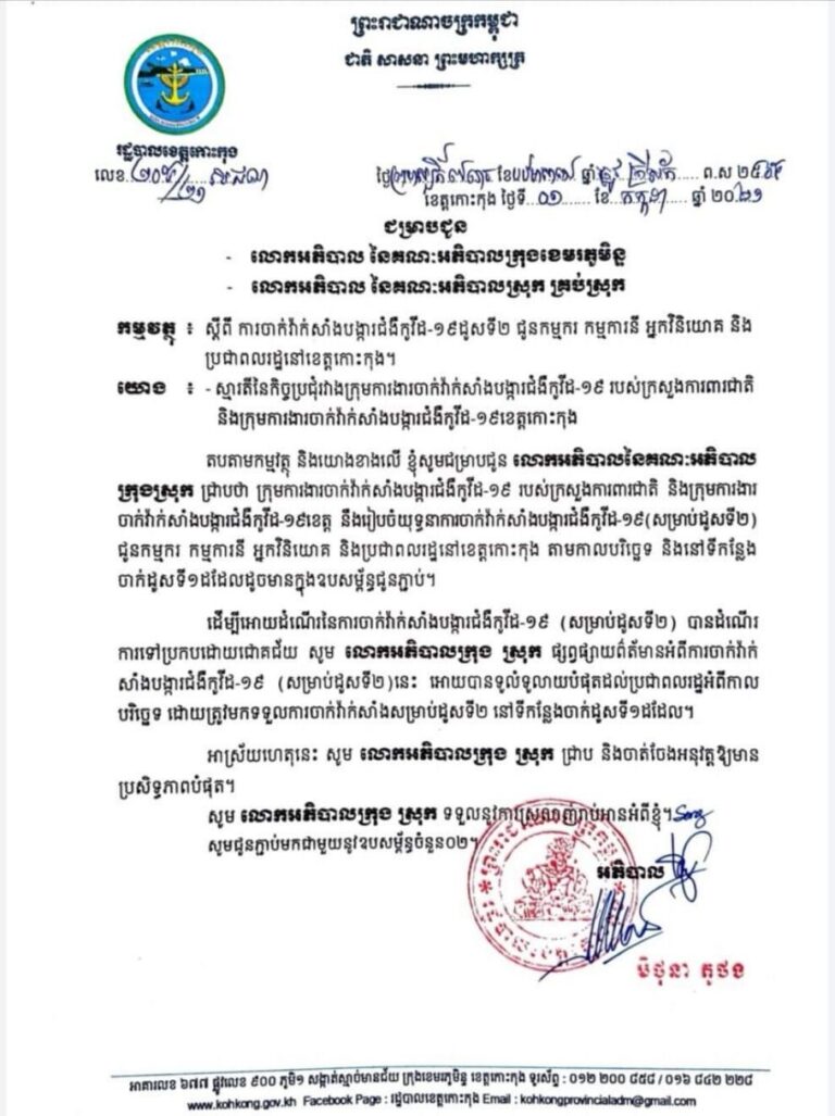 សេចក្តីជូនដំណឹង ស្តីពីការចាក់វ៉ាក់សាំងបង្ការជំងឺកូវីដ-១៩ ដូសទី២ ជូនកម្មករ កម្មការី អ្នកវិនិយោគ និងប្រជាពលរដ្ឋនៅខេត្តកោះកុង