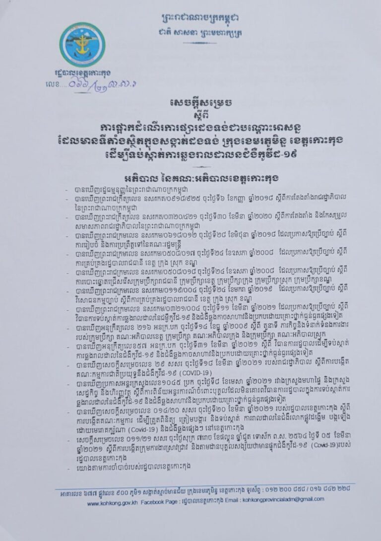 សេចក្តីសម្រេច ស្តីពីការផ្អាកដំណើរការផ្សារដងទង់ជាបណ្តោះអាសន្ន ដែលមានទីតាំងស្ថិតក្នុងសង្កាត់ដងទង់ ក្រុងខេមរភូមិន្ទ ខេត្តកោះកុង ដើម្បីទប់ស្កាត់ការឆ្លងរាលដាលនៃជំងឺកូវីដ-១៩