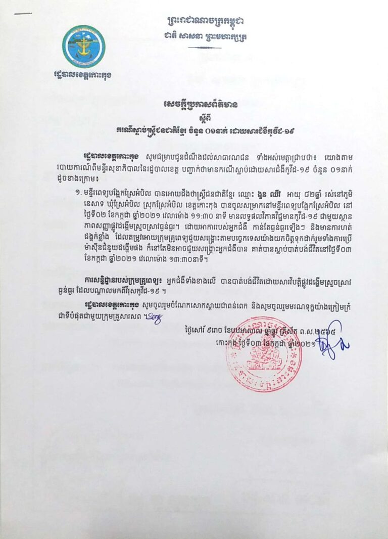 សេចក្តីប្រកាសព័ត៌មាន របស់រដ្ឋបាលខេត្តកោះកុង ស្តីពីករណីស្លាប់ស្ត្រីជនជាតិខ្មែរ ចំនួន ០១នាក់ ដោយសារជំងឺកូវូដ-១៩ នាថ្ងៃទី៣ ខែកក្កដា ឆ្នាំ២០២១