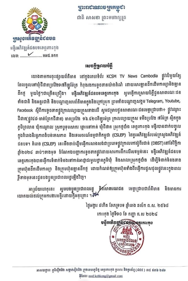 សេចក្តីស្រាយបំភ្លឺ របស់មន្ទីរអភិវឌ្ឍន៍ជនបទខេត្តកោះកុង