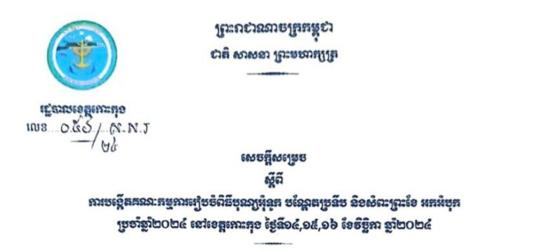 សេចក្តីសម្រេច ស្តីពីការបង្កើតគណៈកម្មការរៀបចំពិធីបុណ្យអុំទូក បណ្តែតប្រទីប និងសំពះព្រះខែ អកអំបុក ប្រចាំឆ្នាំ២០២៤ នៅខេត្តកោះកុង ថ្ងៃទី១៤,១៥,១៦ ខែវិច្ឆិកា ឆ្នាំ២០២៤