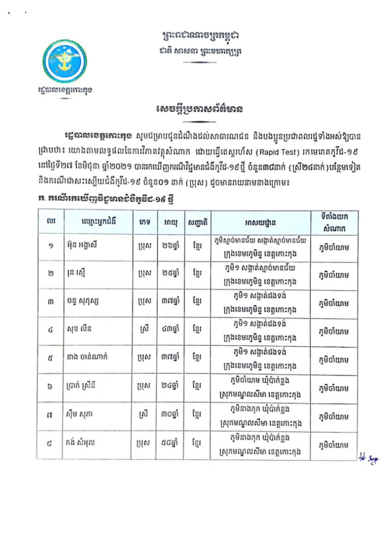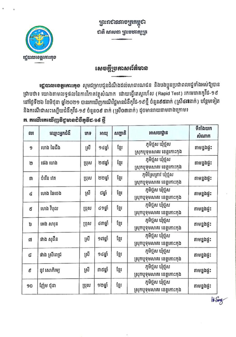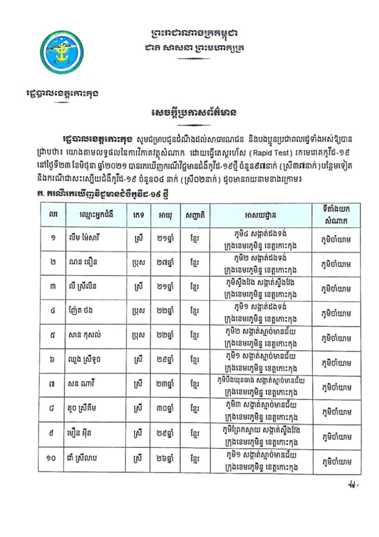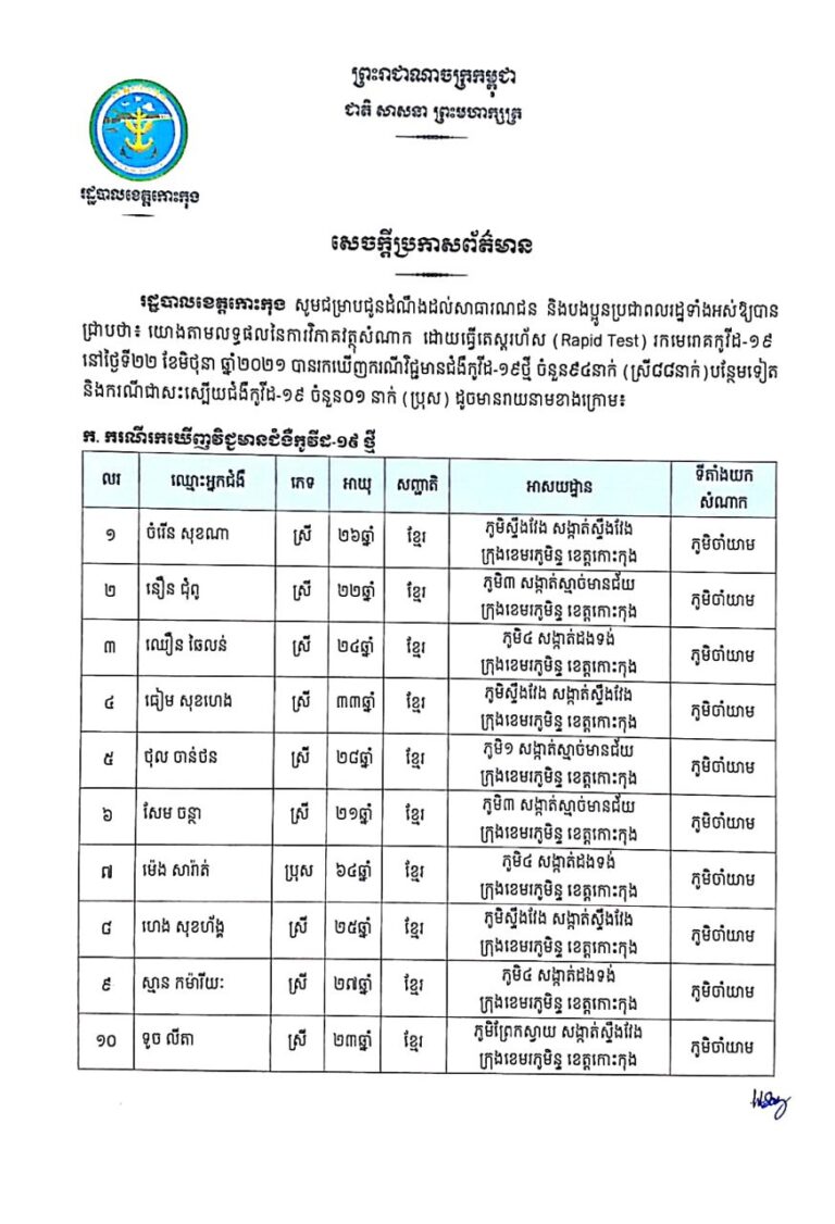 សេចក្តីប្រកាសព័ត៌មាន របស់រដ្ឋបាលខេត្តកោះកុង ស្តីពីការរកឃើញជំងឺកូវីដ-១៩ ចំនួន ៩៩ នាក់ នៅថ្ងៃទី២១ ខែមិថុនា ឆ្នាំ២០២១