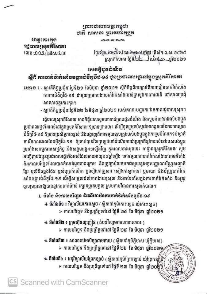 សេចក្តីជូនដំណឹងស្តីពី ទីតាំង និងកាលបរិច្ឆេទនៃដំណើរការចាក់វាក់សាំងបង្ការ ជម្ងឺកូវីដ-១៩ (Covid19 )នៅទូទាំងស្រុកគិរីសាគរ