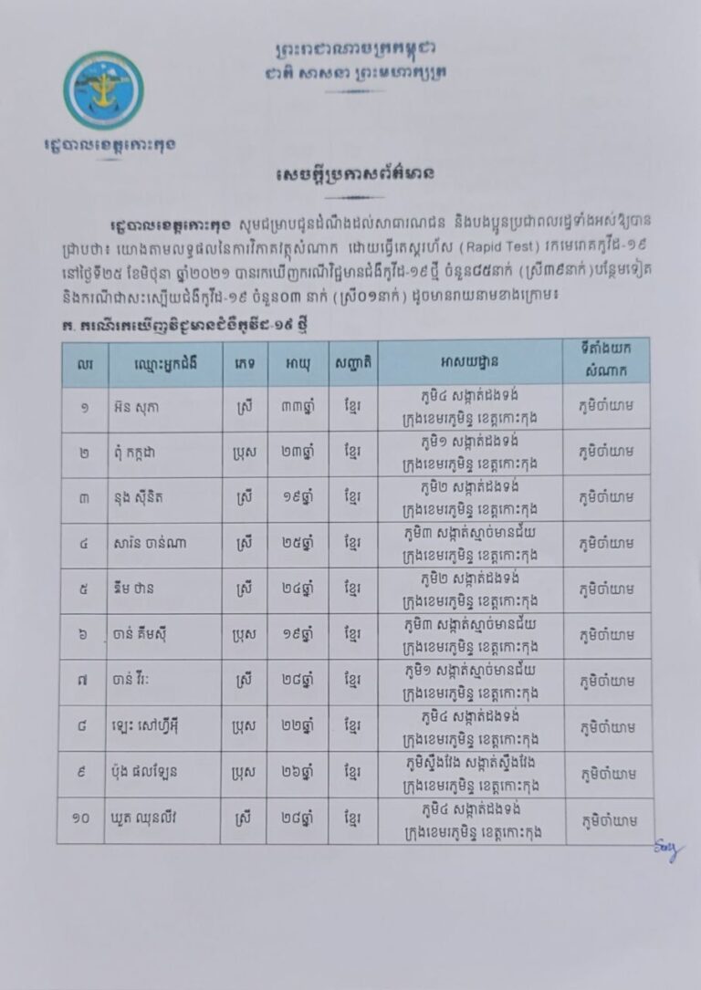 សេចក្តីប្រកាសព័ត៌មាន របស់រដ្ឋបាលខេត្តកោះកុង ស្តីពីការរកឃើញករណីវិជ្ជមានជំងឺកូវីដ-១៩ ចំនួន ៨៥ នាក់ និងករណីជាសះស្បើយ ចំនួន ០៣ នាក់ ថ្ងៃទី២៥ ខែមិថុនា ឆ្នាំ២០២១