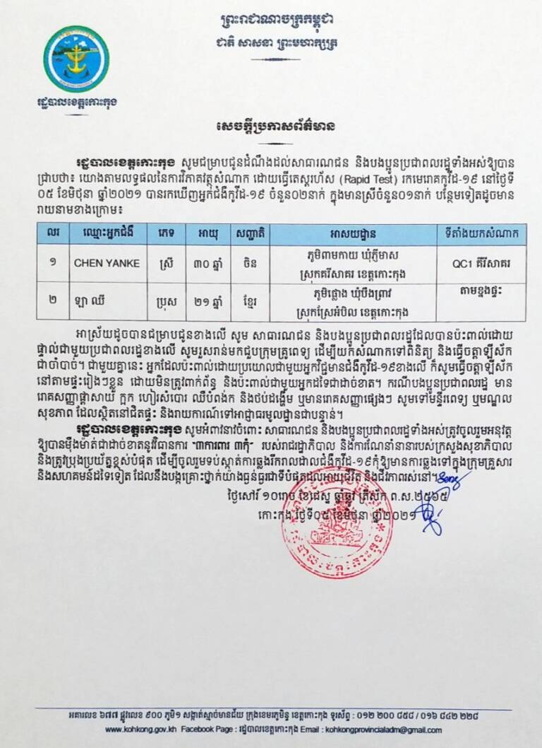 សេចក្តីប្រកាសព័ត៌មាន របស់រដ្ឋបាលខេត្តកោះកុង ស្តីពីការរកឃើញអ្នកជំងឺកូវីដ-១៩បន្ថែម ចំនួន ០២ នាក់