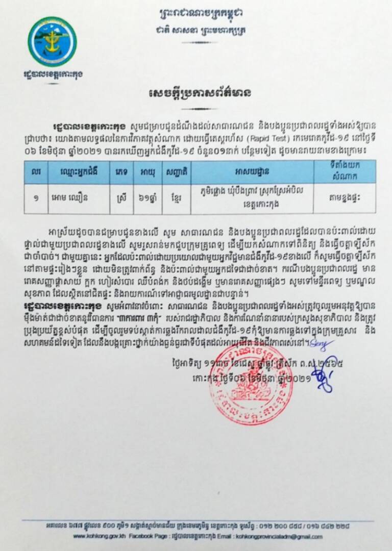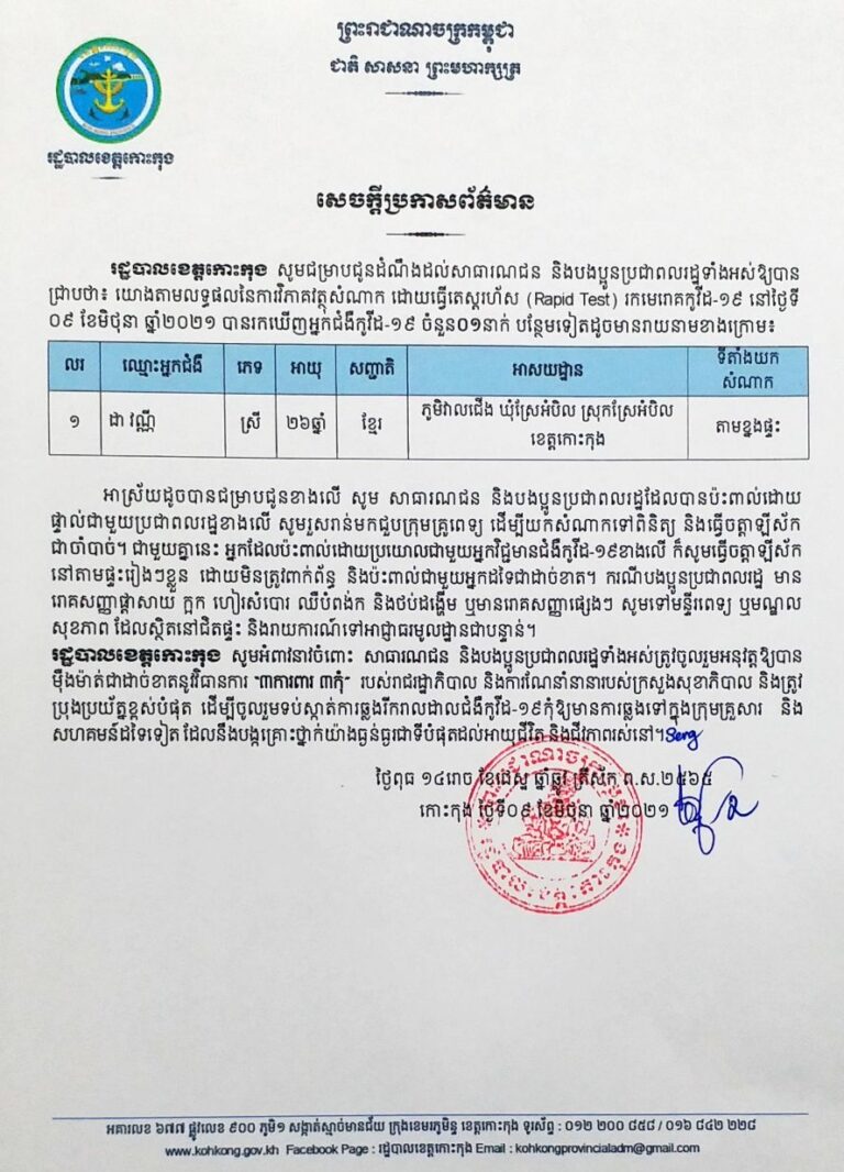 សេចក្តីប្រកាសព័ត៌មាន របស់រដ្ឋបាលខេត្តកោះកុង ស្តីពីការរកឃើញអ្នកជំងឺកូវីដ-១៩បន្ថែម ចំនួន ០១ នាក់