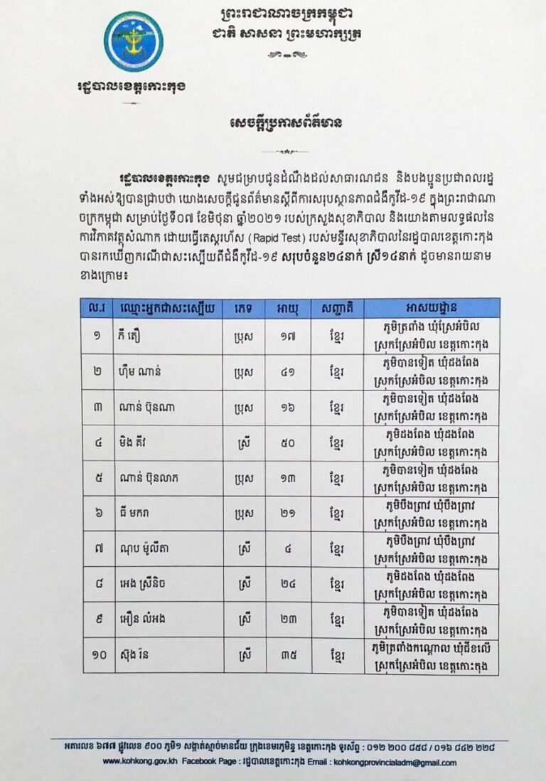 សេចក្តីប្រកាសព័ត៌មាន របស់រដ្ឋបាលខេត្តកោះកុង ស្តីពីការរកឃើញករណី ជាសះស្បើយពីជំងឺកូវីដ-១៩ សរុបចំនួន ២៤ នាក់ ក្នុងនោះស្រី ១៤ នាក់