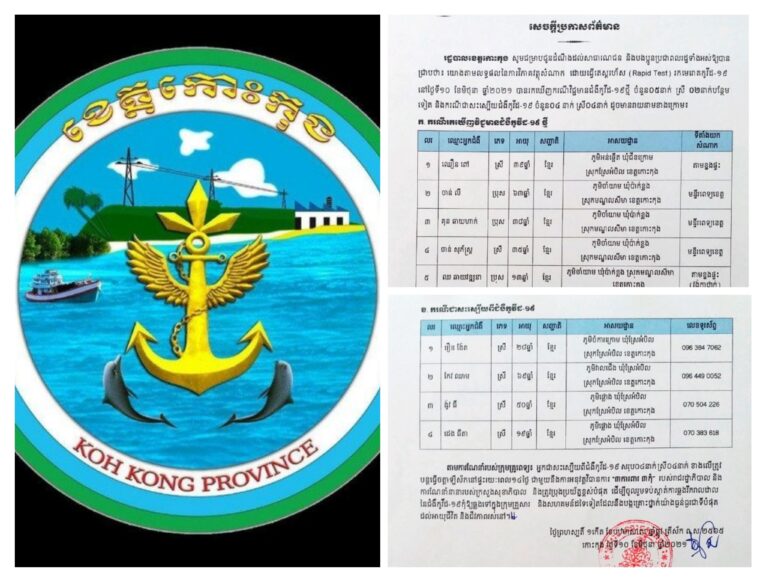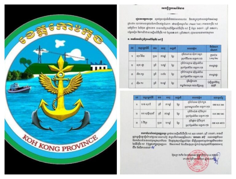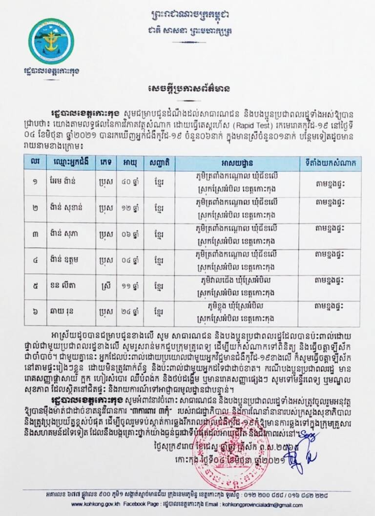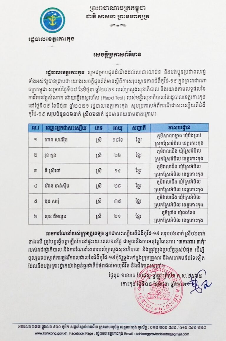 សេចក្តីប្រកាសព័ត៌មាន របស់រដ្ឋបាលខេត្តកោះកុង ស្តីពីការរកឃើញអ្នកជំងឺកូវីដ-១៩បន្ថែម ចំនួន ០៦ នាក់