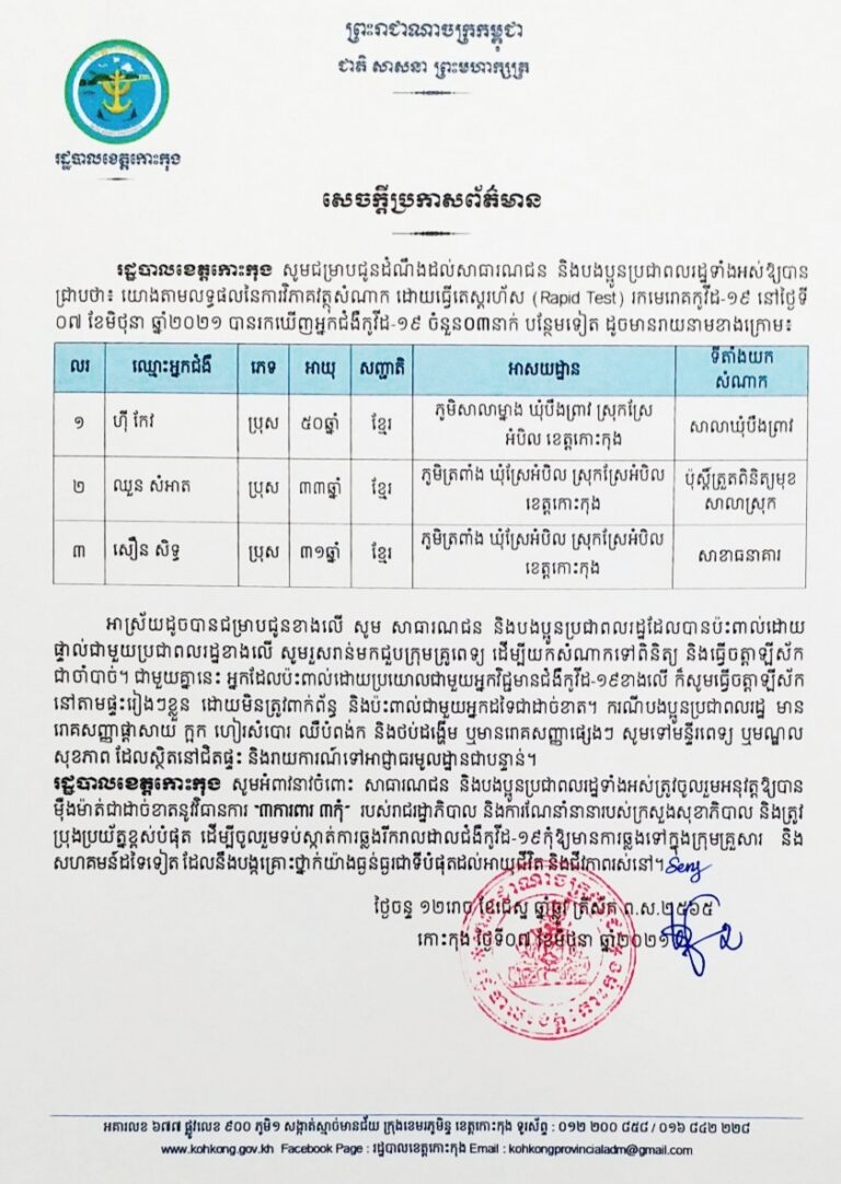 សេចក្តីប្រកាសព័ត៌មាន របស់រដ្ឋបាលខេត្តកោះកុង ស្តីពីការរកឃើញអ្នកជំងឺកូវីដ-១៩បន្ថែម ចំនួន ០៣ នាក់