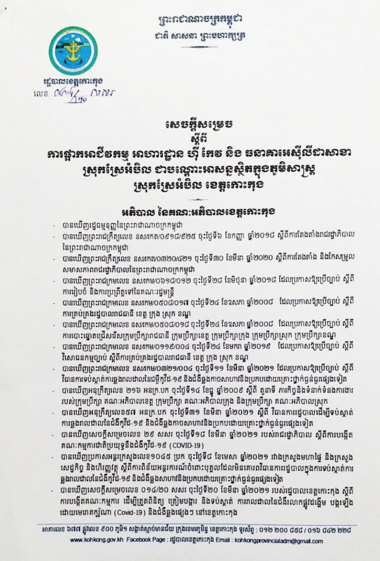 សេចក្តីសម្រេច ស្តីពីការផ្អាកអាជីវកម្ម អាហារដ្ឋាន ហ៊ី កែវ និងធនាគារអេស៊ីលីដាសាខាស្រុកស្រែអំបិល ជាបណ្ដោះអាសន្ន ស្ថិតក្នុងភូមិសាស្ត្រស្រុកស្រែអំបិល ខេត្តកោះកុង