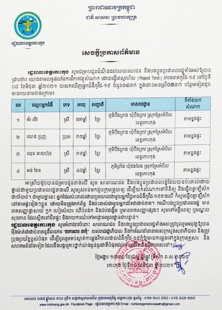 សេចក្តីប្រកាសព័ត៌មាន របស់រដ្ឋបាលខេត្តកោះកុង ស្តីពីការរកឃើញករណីវិជ្ជមានជំងឺកូវីដ-១៩ ចំនួន ០៤ នាក់ និងជាសះស្បើយ ចំនួន ០៣ នាក់