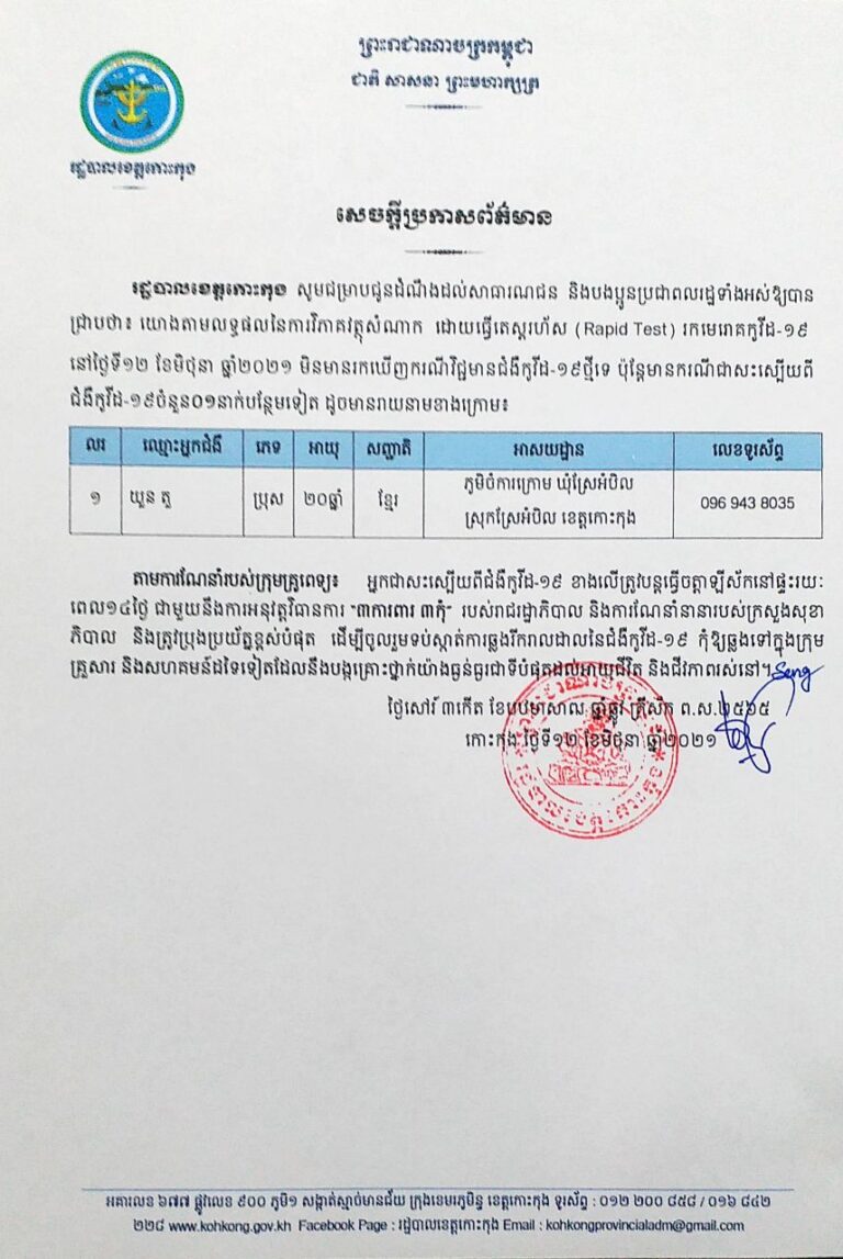 សេចក្តីប្រកាសព័ត៌មាន របស់រដ្ឋបាលខេត្តកោះកុង ស្តីពីការរកមិនឃើញករណីវិជ្ជមានជំងឺកូវីដ-១៩ ប៉ុន្តែមានករណីជាសះស្បើយ ចំនួន ០១ នាក់