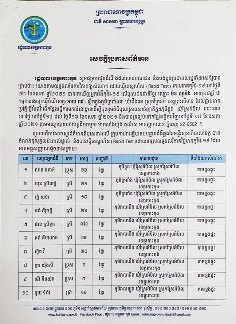 សេចក្តីប្រកាសព័ត៌មាន របស់រដ្ឋបាលខេត្តកោះកុង