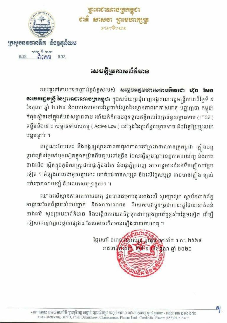 សេចក្តីប្រកាសព័ត៌មាន របស់ក្រសួងធនធានទឹក និងឧតុនិយម