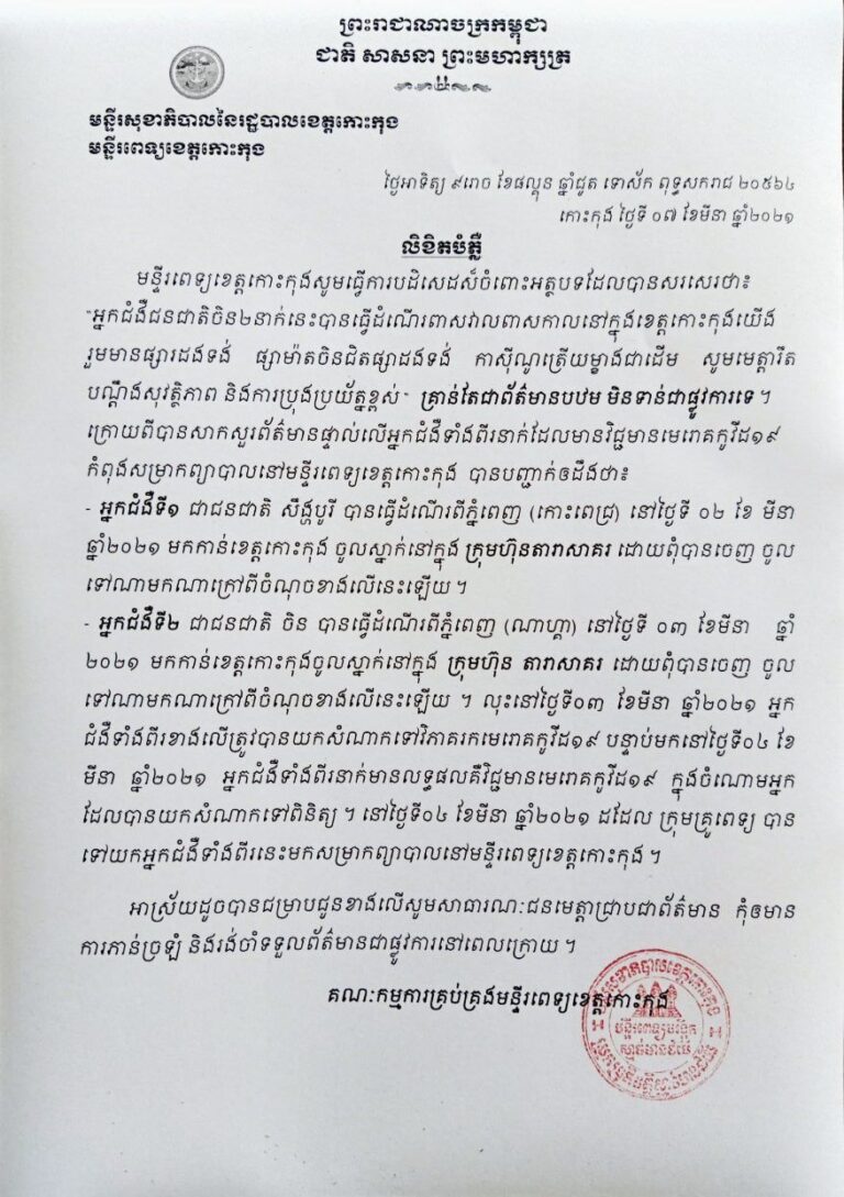 សេចក្តីបំភ្លឺ របស់មន្ទីរពេទ្យខេត្តកោះកុង
