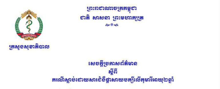 សេចក្តីប្រកាសព័ត៌មាន ចុះថ្ងៃទី៩ ខែតុលា ឆ្នាំ២០២៣ អំពីករណីស្លាប់កុមារី អាយុ២ឆ្នាំ ១នាក់ទៀត ដោយសារជំងឺផ្តាសាយបក្សី នៅខេត្តព្រៃវែង របស់ក្រសួងសុខាភិបាល