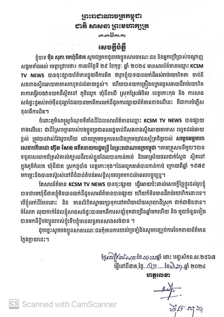 សេចក្តីបំភ្លឺ របស់លោក ម៉ឹង សុភា មេឃុំជីផាត ករណីមានសារព័ត៌មានឈ្មោះ KCSM TV NEWS បានចុះផ្សាយព័ត៌មាន ផ្ទុយពីការពិត កាលពីថ្ងៃទី ២៩ ខែកុម្ភៈ ឆ្នាំ ២០២៤ ធ្វើឲ្យបងប្អូនសាធារណៈជន និងអ្នកប្រើប្រាស់បណ្តាញសង្គមទាំងអស់ មានការភាន់ច្រឡំចំពោះលោក ម៉ឹង សុភា មេឃុំជីផាត ។